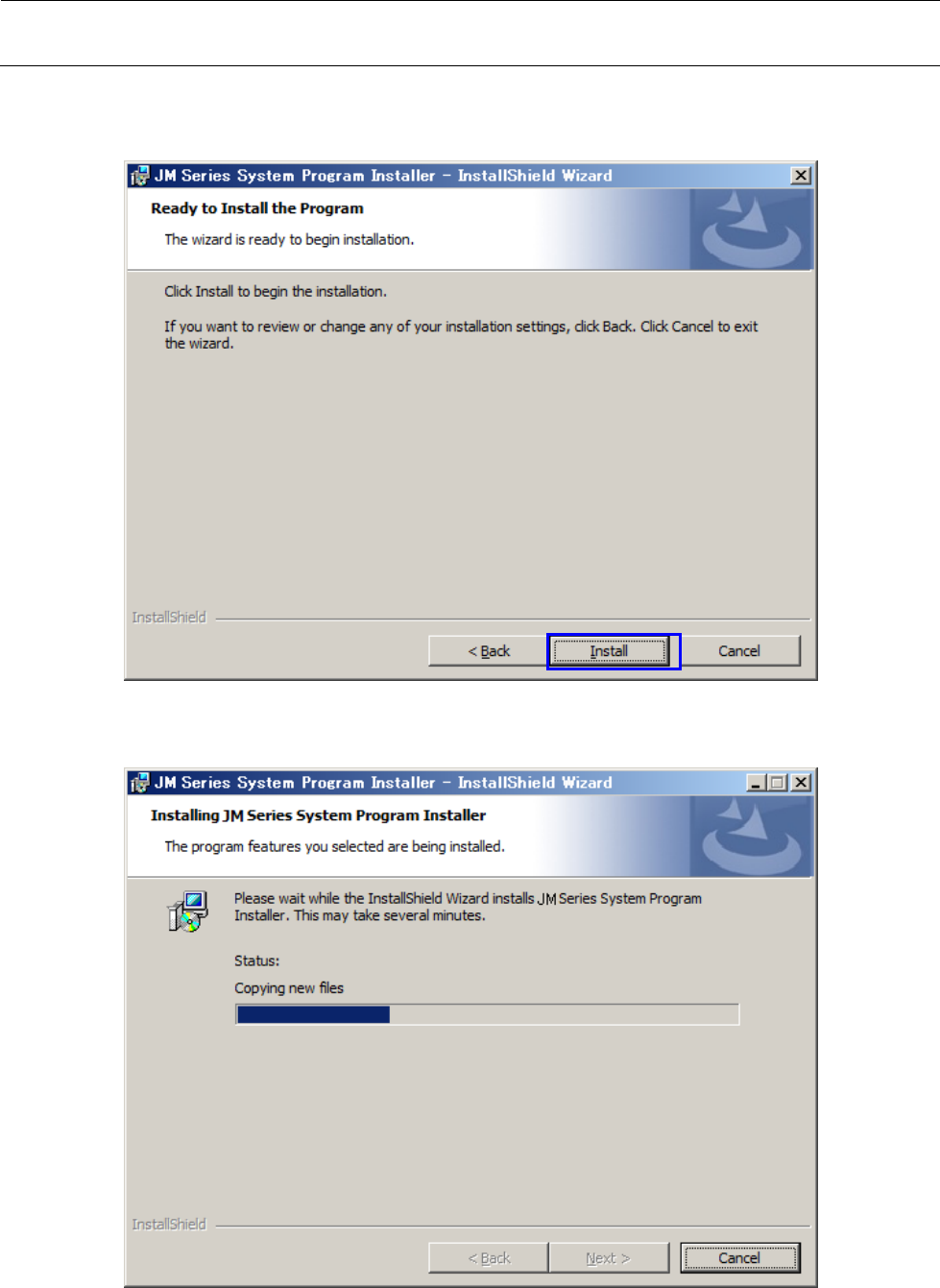 维修调整要领书 13 - 60 8 ) 显示安装开始前的确认画面。 请点击 [install] 按钮进到 9 )。 9 ) 安装中间,进行状态以进展条显示。