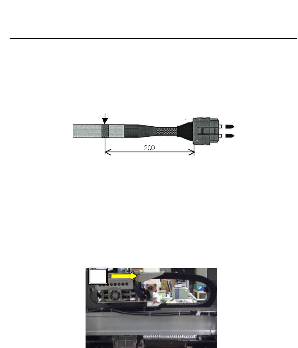 维修调整要领书 1- 15 1-4 -2 . 电缆标识( X )的确认 1 ) 确认 OPTI CAL FIBE R CABLE 8M 的标识位置。 (位置是离开插接器端 200 mm ) 图 1 -4- 2-2 1-4 -3 . 电缆的装配 1 ) 给各电缆、 ( XY 电缆、 OPTICAL FIBER CABLE 8M ) 放进电缆拖链的部分涂敷润滑油 ,按 照 X 轴电 缆拖链的 A 向视图配置电缆、空气管。 ※ 请注意插座朝向…