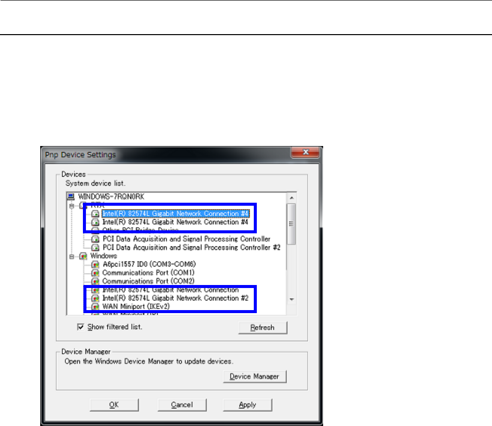 维修调整要领书 14-15 13) 进行安装完成确认。 从控制面板->RTX Properties->“Hardware”的选项卡中,按下 Device 的 Settings…按钮, 将显示设备树。 请确认 Windows 下有 2 个设备移动。 (PCI 总线 1 及 PCI 总线 2 的设备已移动。) 打开 RTX 下网络设备的属性。