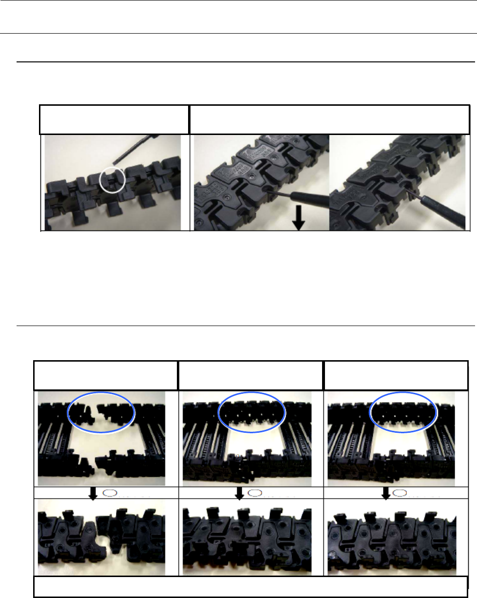 2) 把一字螺丝刀朝箭头方向撬即可使链板键脱开。