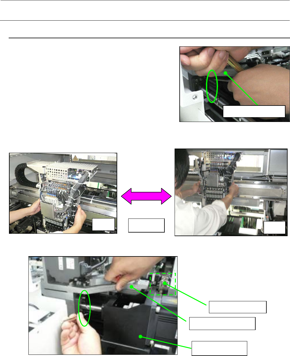 维修调整要领书 1- 43 1-7 -4 . Y 滚珠螺杆的调整 ( 1 ) 将 X_AXIS_FRA ME_ASM 向前侧靠 ,靠 到 扳手刚好伸 得进为止 , 进一步旋紧装置内侧的螺丝 ( SM6062002TN ) 2 个。 ( 2 ) 来回几次移动 HEAD_UNI T ,使 X_AXIS_FRAME_ASM 从 前侧 Y_STOPPER 移动至触碰后侧 Y_STOPPER ,检查移动是否阻滞。 移动阻滞时,回到 1-7-4 (…