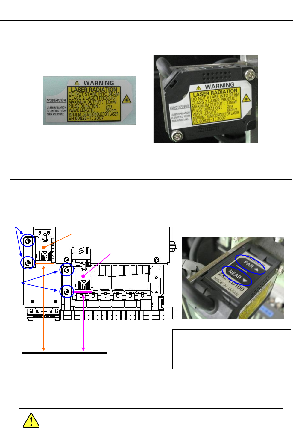 此时,FAR 灯和 NEAR 灯均亮灯,请进行确认。调整后,用①带垫片内六角螺栓(各 2 个)进行固定。