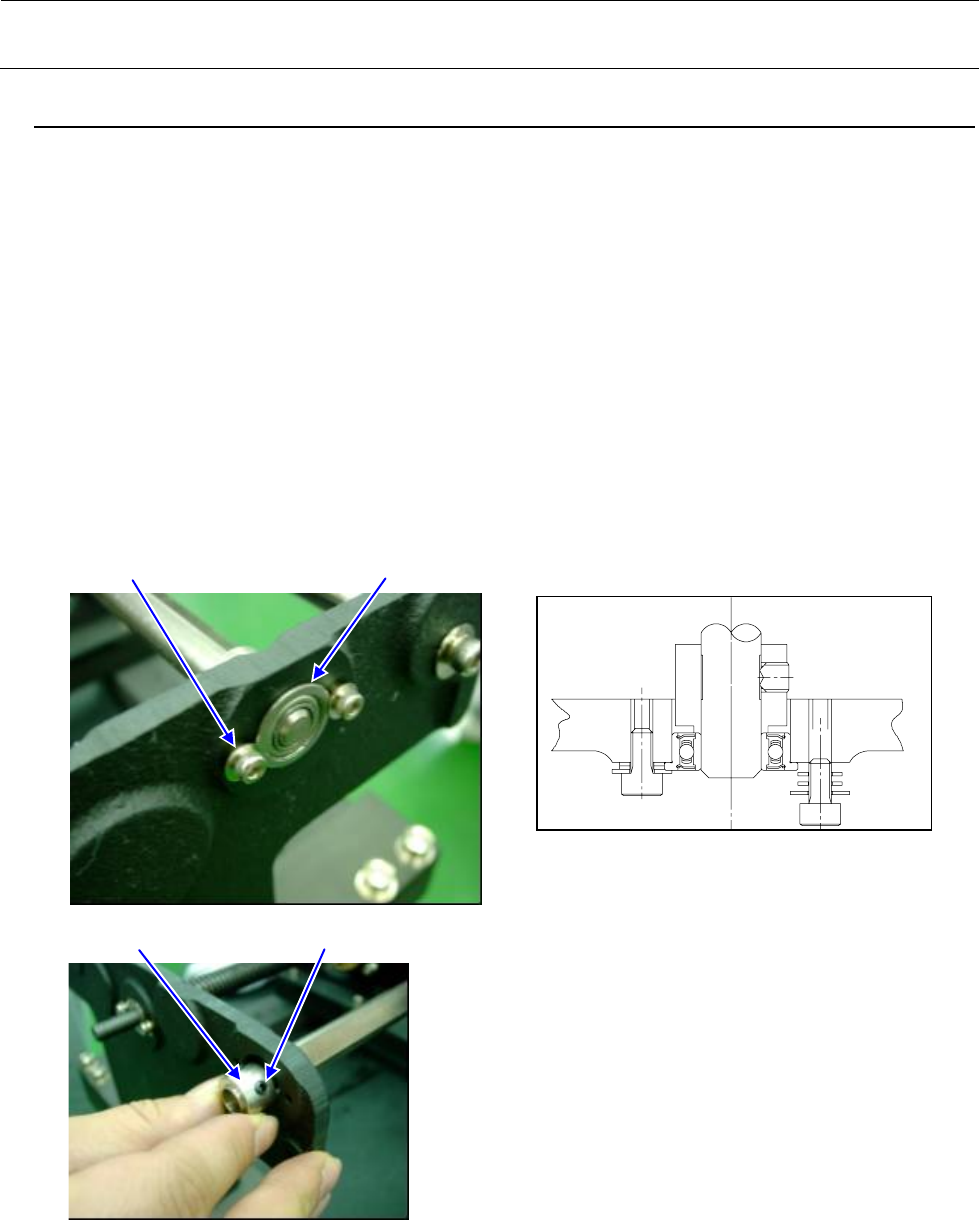 维修调整要领书 5-7 5-5 -2 . 传送电动机用同步皮带的更换 1 ) 要更换 IN/O UT 电动机的同步皮带时,依照【 5-3 】的步骤 2 )卸下同步皮带;更换 CENTER 电动 机的同步皮带时,依照【 5-4 】的步骤 2 )。 2 ) 拆下从动侧轨道架的轴承固定螺丝 ① ,卸下轴承 ② 。 ※ 注)固定螺丝使用 3 片垫圈。卸下时请注意不要丢失 3 ) 松开限动环定位螺丝 ③ ,从驱动轴上拆下限动环 ④ 。 4 ) 将…