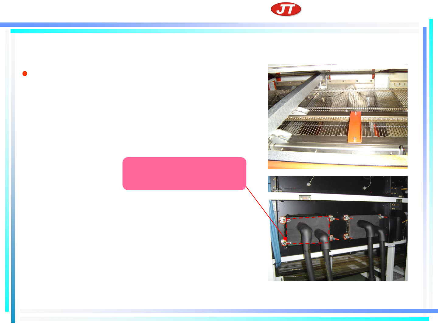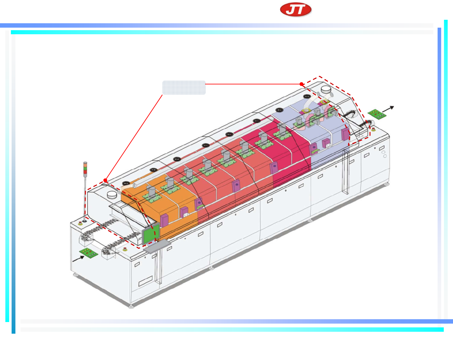 深圳市 劲拓自动化设备股份有限公司 SHENZHEN JT A UTOMA TION EQUIPMENT CO.,LTD. 4 )系统 详介 冷却系 统特点 新式冷却结构设计事大部分废气过滤或 回收后返回炉 内,减少了热量的 损失。