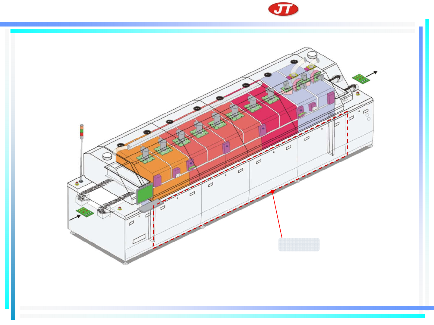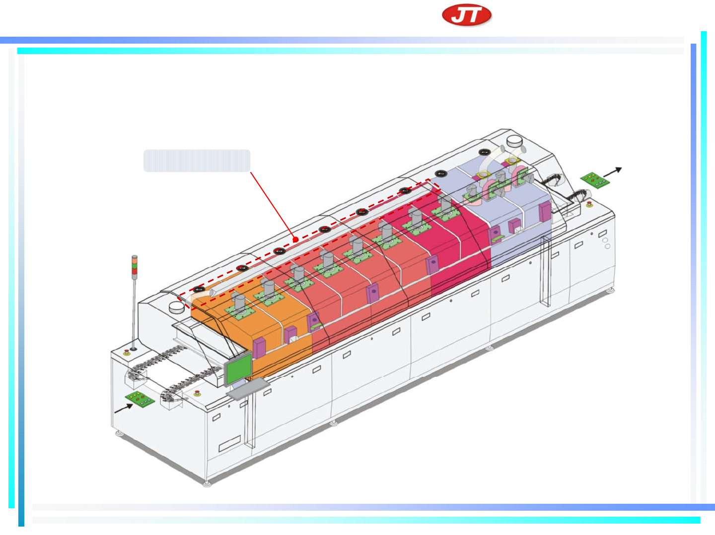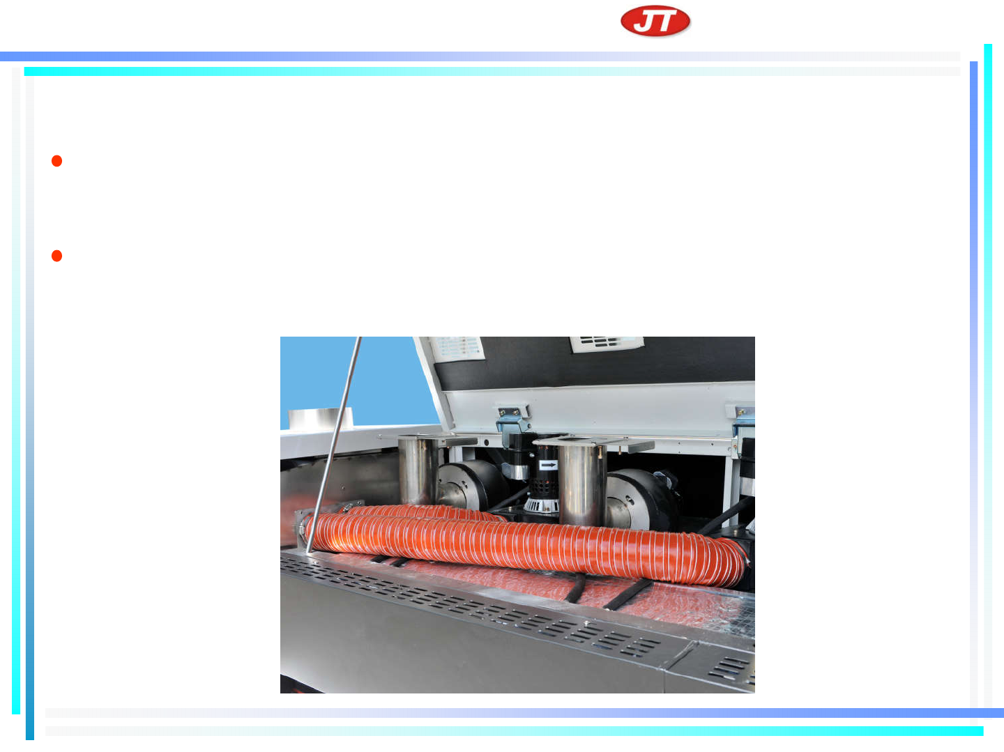深圳市 劲拓自动化设备股份有限公司 SHENZHEN JT A UTOMA TION EQUIPMENT CO.,LTD. 助焊剂 回收系 统特点 4 )系统 详介 新式冷却结构设计使大部分废气过滤或 回收后返回炉 内,使助焊剂的回 收更彻底。 炉膛保养清洁周期可延长一倍左右: 空气炉平均约为 45-55 天 / 次;氮气炉平均 约为 25-35 天 / 次