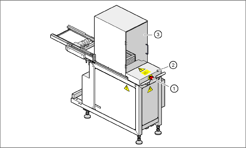 Sul retro dello scambiatore automatico di vassoi si trovano il tasto d'arresto d'emergenza e