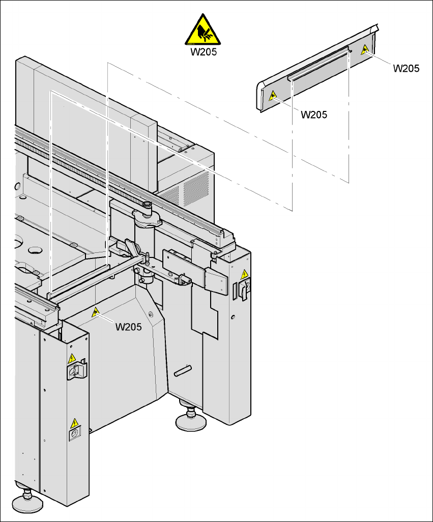 Fig. 2.2 - 5 Cartello d'avvertenza W205 nel lato superiore del dispositivo di taglio della cinghia