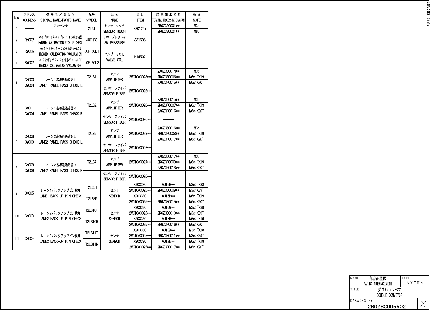 Z Z E R O S E N S O R PTS-NXT3c-07 673 部品配置図 PARTS ARRANGEMENT N A M E T Y P E N X T I c DOUBLE CONVEYOR T I T L E D R A W I N G N o . 2 RGZBC 005502 備 考 7 KI / X ADDRESS 信 号 名 / 部 品 名 記 号 品 名 端 末 加 工 図 番 mm . FR 3 C…