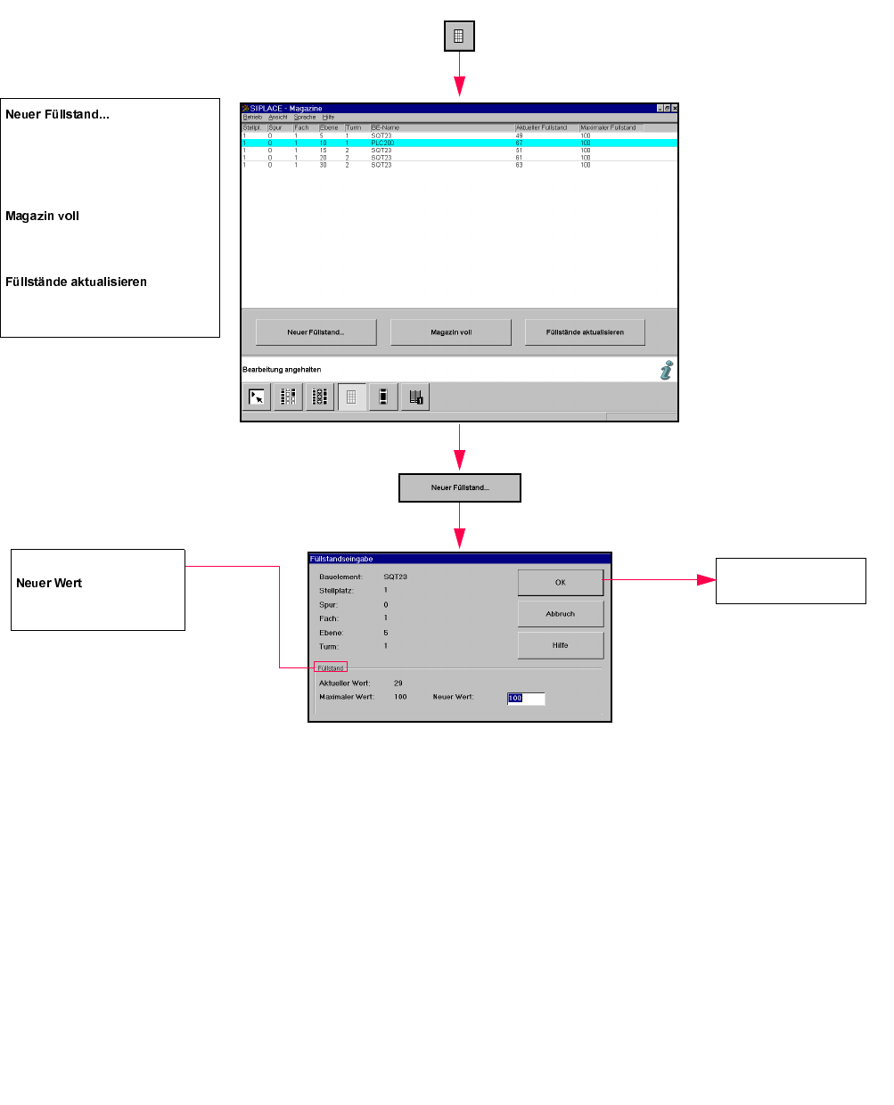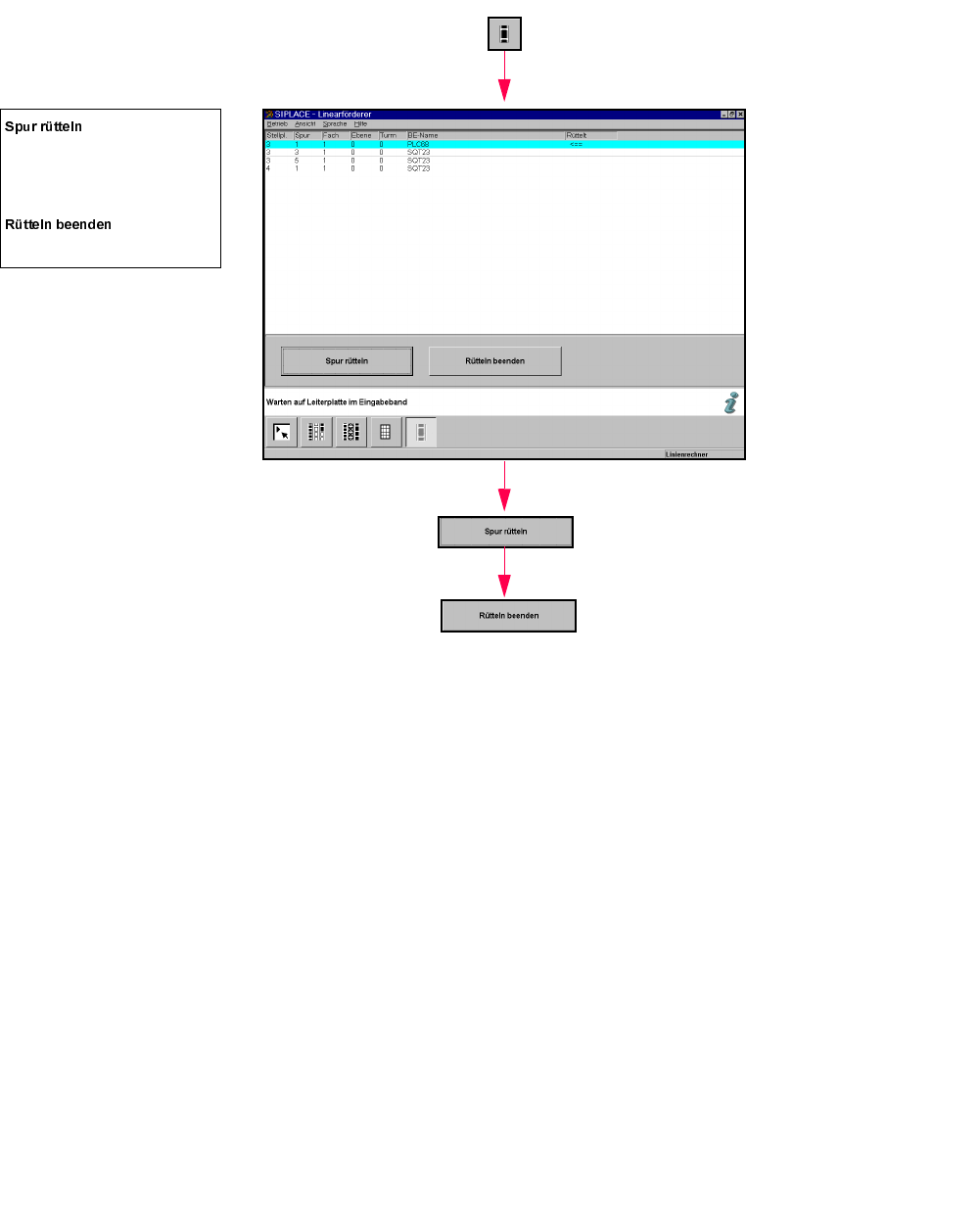 SIPLACE Soft warekurzanleitung f ü r SR.502.xx 6 von 8 )|UGHUHU/LQHDUI|UGH UHUDQ]HLJHQXQGUWWHOQ1XU6+0 Di e ausg ew ä hlt e S pur w ird so ger ü ttelt, d ass neue B auelemen te im S tangenmag azin na ch vor…