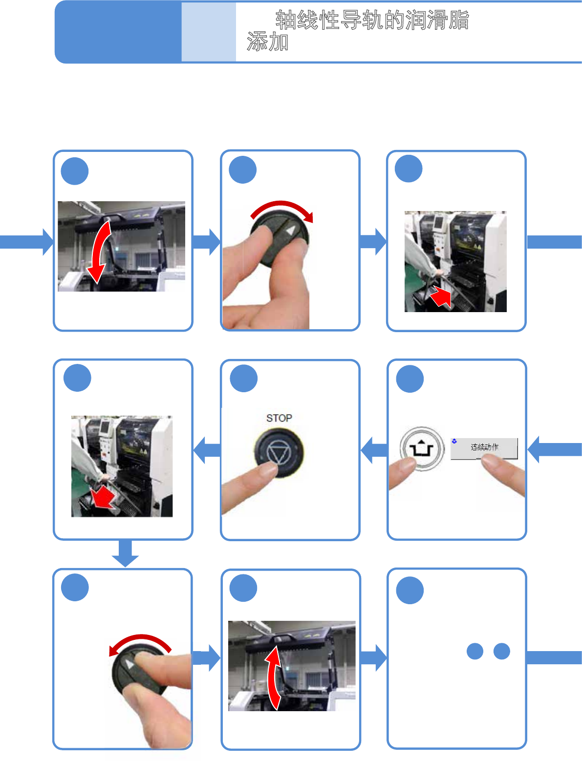 EJM8D C - MB - 04E - 00 NPM - DX 4-3 -4 顺序 12 10 Y 轴线性导轨 ( 左侧 ) 11 附着的润滑脂 Y 轴线性导轨 ( 右侧 ) 擦去溢出的润滑脂 ● 擦去从 X 轴、 Y 轴的 线性导轨溢 出的润滑脂和轨道滑 动面以外附着 的润滑脂。 溢出的润滑脂 ●从对面侧的贴 装头以目视确 认线性导轨的 轨道部的安装 孔,如果有润 滑脂积存,请擦拭干 净。 线性导轨 轨道部的安装孔 溢出的润滑脂 积…