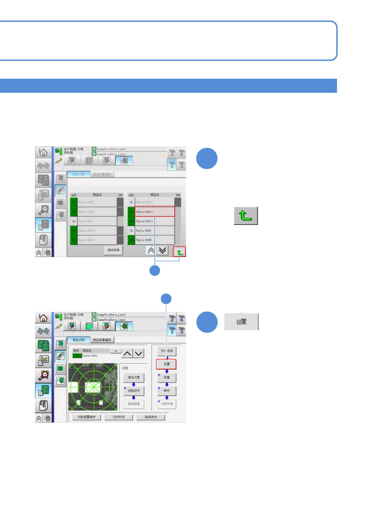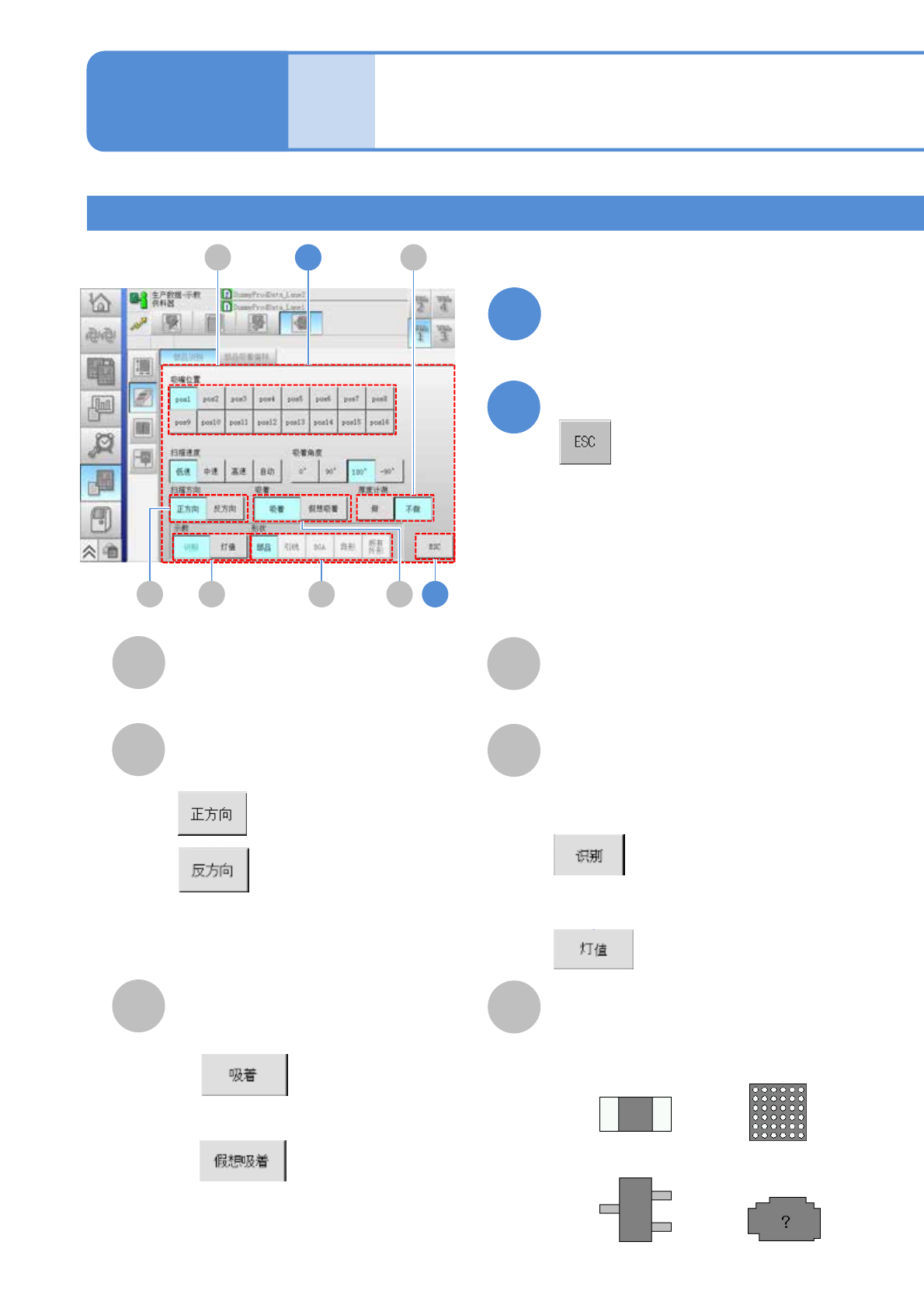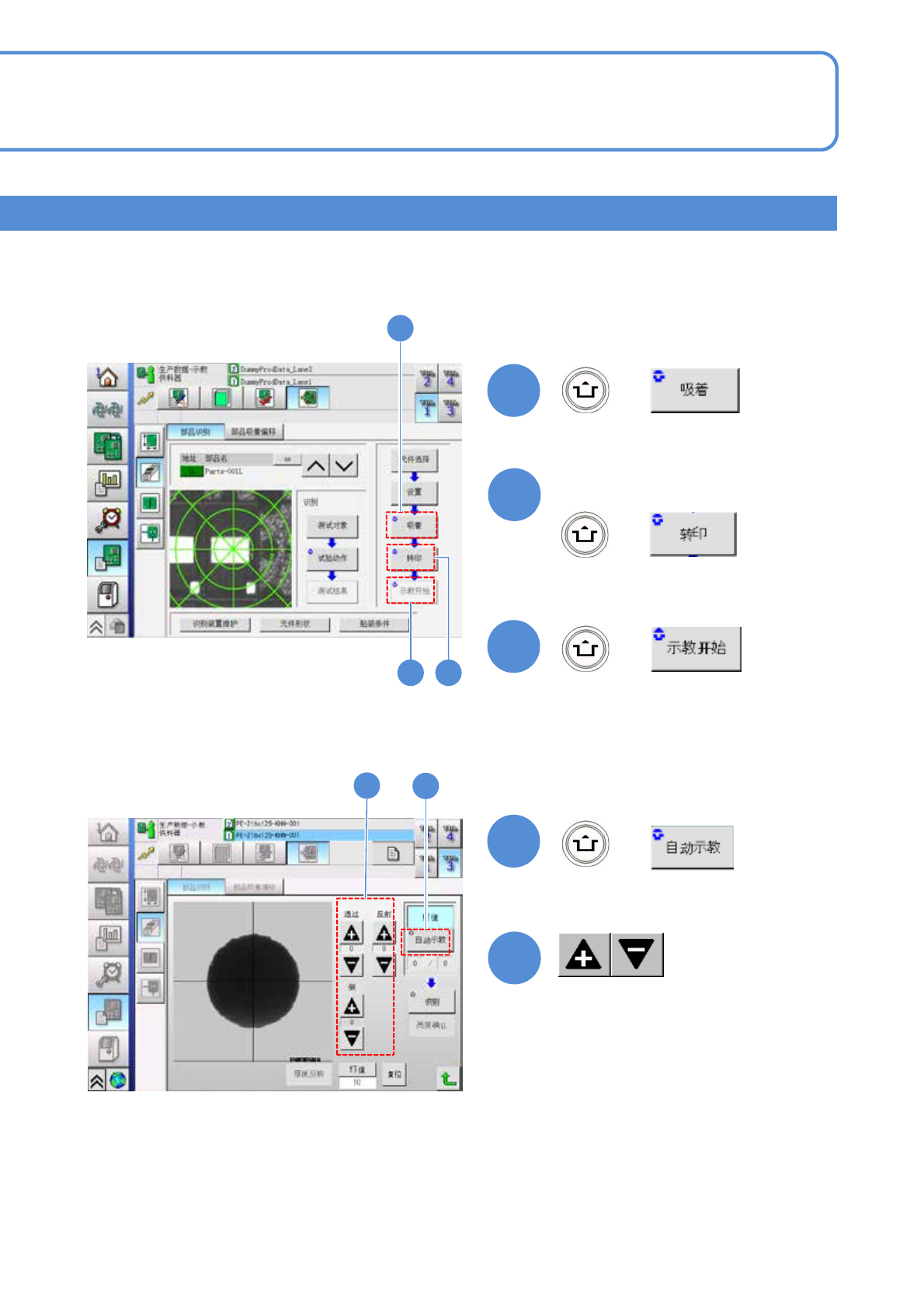 EJM8DC-MB-12E-0 2 NPM-DX D E F B A C 吸着 ■自动吸着元件时 ■手动吸着元件时 12-2-4 -5 元件识别示教 2 生产数据 示教 元件识别示教 3 工程师手册 12-2-4 选择吸着条件 设定完毕 吸嘴位置 使吸嘴吸着的位置。 扫描方向 识别时的方向 : 左 → 右 : 右 → 左 厚度计测 示教 示教的对象。 形状 示教元件的 4 个形状种类。 ■通过多功能识别照相机识别元件时 ■调节识别图像的…