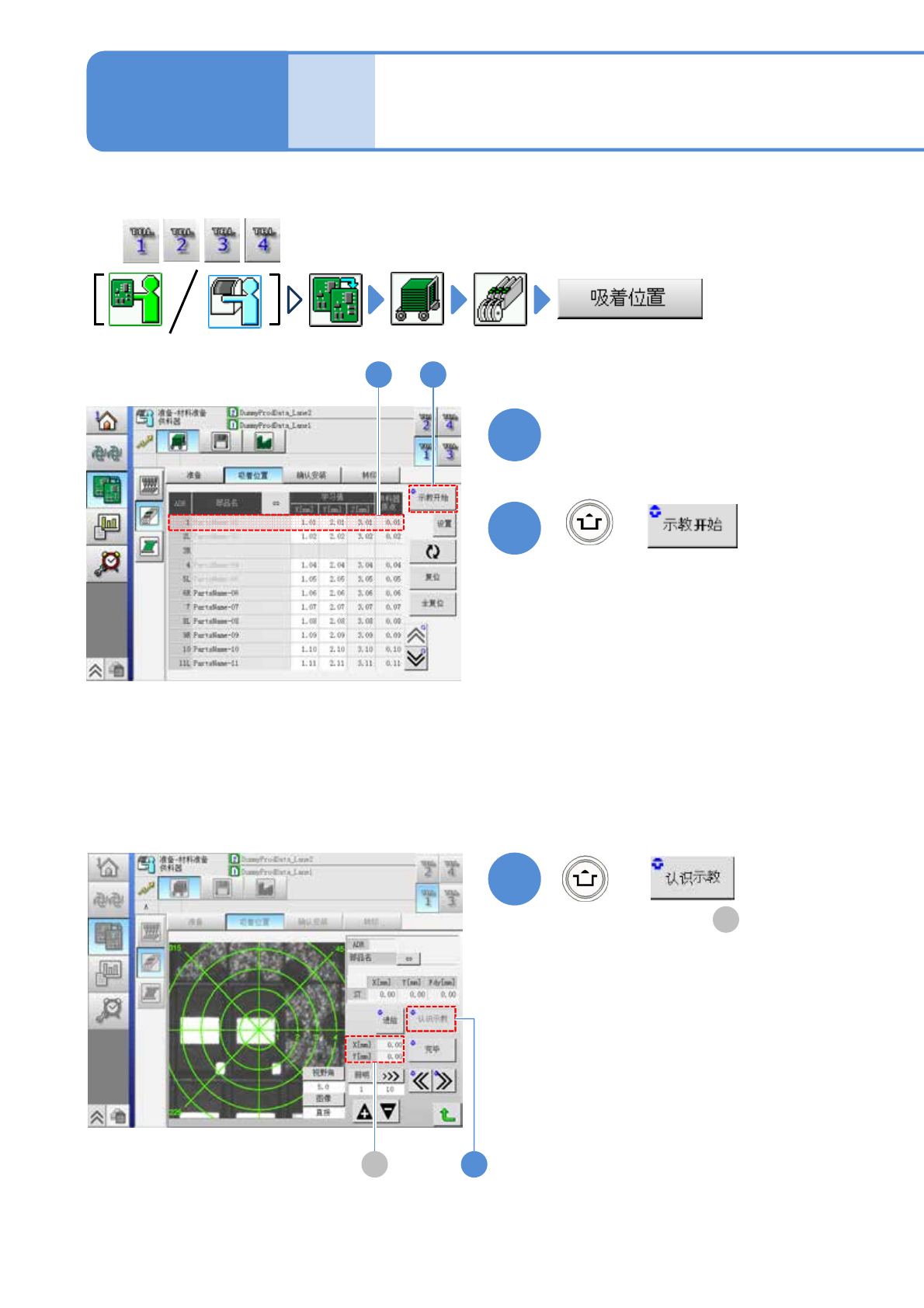 EJM8DC-MB-12E-0 2 NPM-DX 生产数据 示教 吸着位置学习示教 1 1 + 3 2 12-2-8 -1 ■ 自动示教时 + 工程师手册 12-2-8 选择示教元件 ( 贴装头照相机移动到吸着位置,显示 元件图像 ) 在生产时,可对每个供料器地址确认 吸附位置学习的补正值。另外, 当学习值存在问题时,即进行示教。 ( 开始认识示教,并在 显示结果 ) A ●当编带宽度为 4 mm 或 8 mm 时,只可对设有吸着 位置…