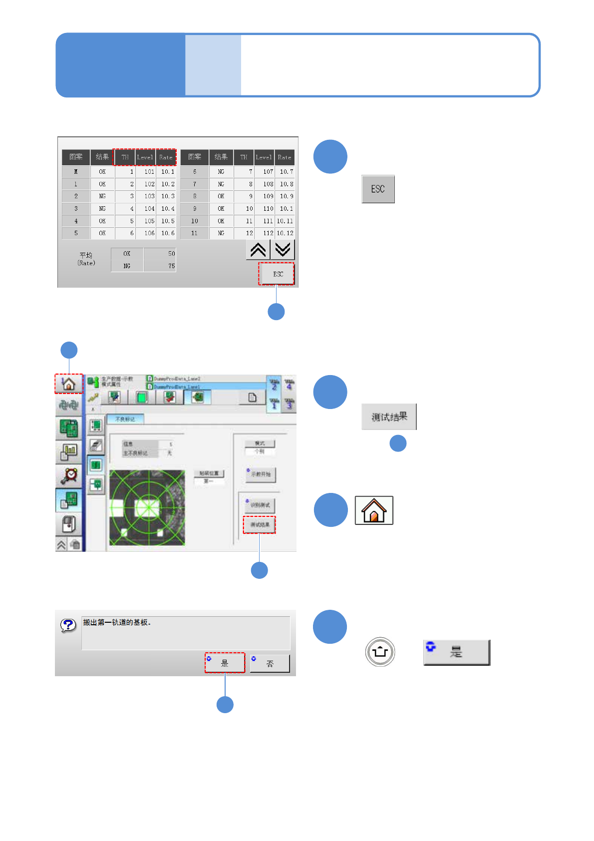 EJM8DC-MB-12E-0 2 NPM-DX 12-2-10 -5 生产数据 示教 不良标记识别示教 3 工程师手册 12-2-10 17 15 14 16 + 确认提示 再次确认测试结果时 ( 显示 的测试结果 ) 11 确认识别结果后 ●可以转移到其他画面。 TH: 阈值 Level: 亮度 Rate: 像素比率 15 16 17 14