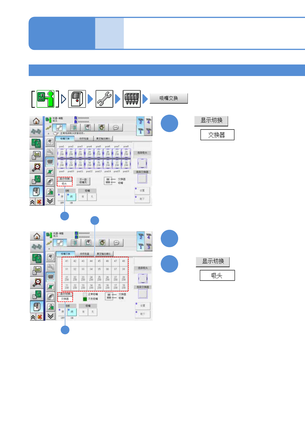 EJM8DC-MB-13E-0 3 NPM-DX 13-2-5 -2 B A C + + 选择吸嘴的有无。 或者 ■ 打开挡板时 ■ 关闭挡板时 吸嘴交换器挡板的开闭 作为不一致吸嘴,以黄色表示的吸嘴 位 置,设定为无吸嘴。 ●如果安装了与生产数据不同的吸嘴 时, 就作为不一致的吸嘴用黄色来表示。 ( 在此状态下将不能进行吸嘴的安装和 拆卸 )