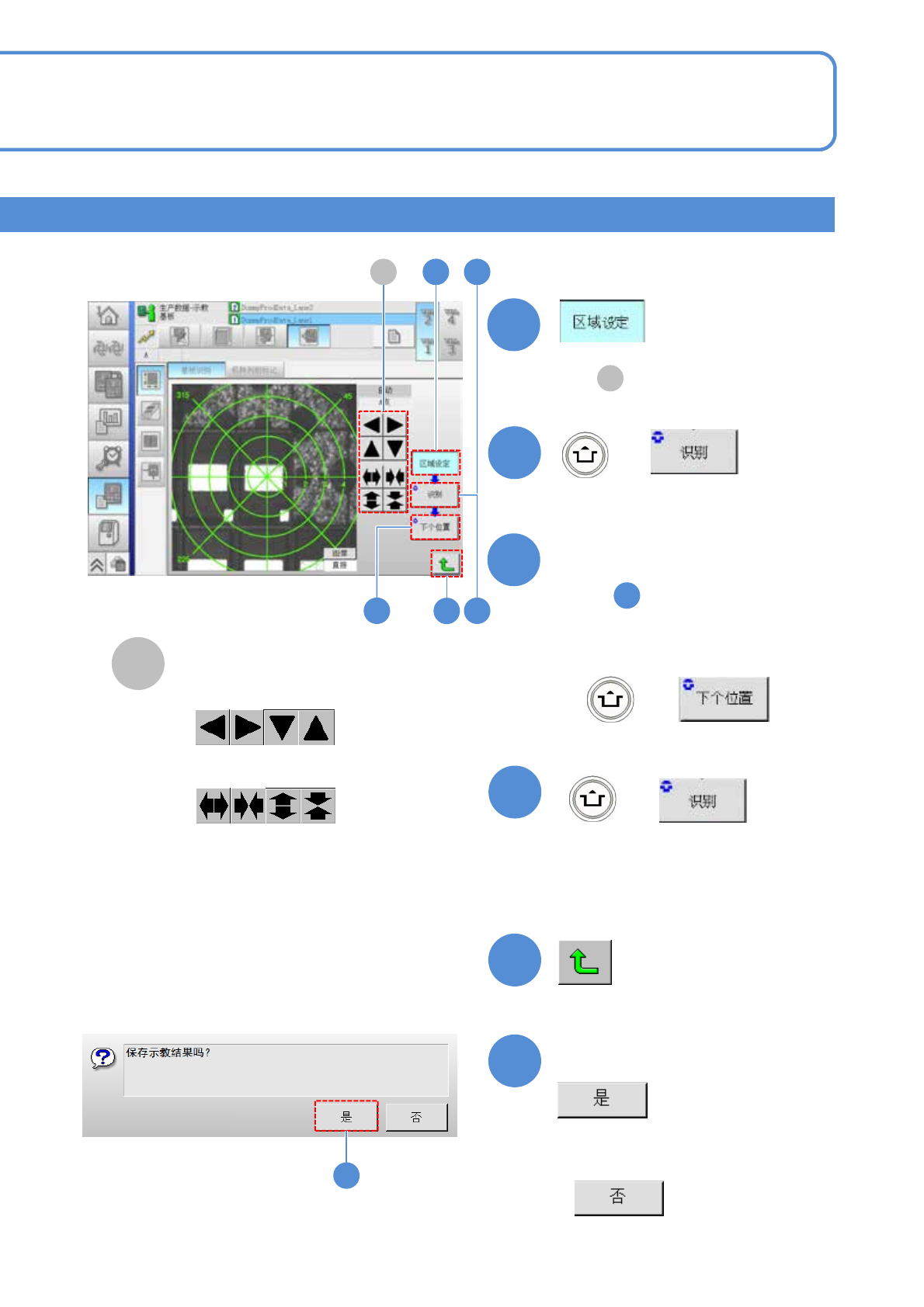 EJM8DC-MB-12E-0 2 NPM-DX 9 8 7 A + 12-2-2 -4 + 10 + 11 12 ●变更识别区域的位置、尺寸时, 在 进行调整。 A ( 显示识别结果 ) 11 ■识别标记为 1 点时 至 识别区域的调整 ■调整位置时 ■调整尺寸时 ■识别标记为 2 点、 3 点时 ( 显示识别结果 ) ●识别标记为 3 点时,再次执行。 确认提示 ■不保存示教结果时 12 9 7 A 8 11 10