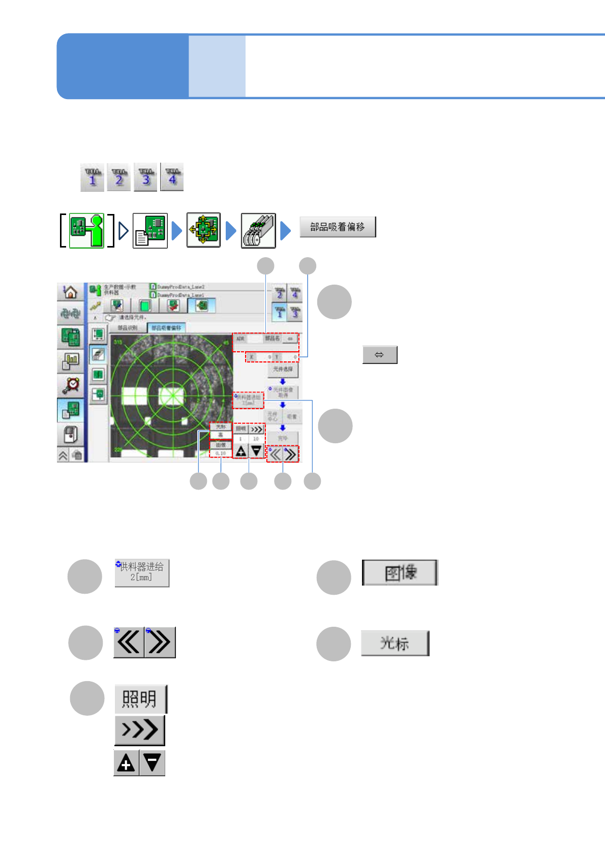 EJM8DC-MB-12E-0 2 NPM-DX 生产数据 示教 元件吸着偏移示教 1 12-2-6 -1 工程师手册 12-2-6 C A B ADR X,Y G E F D 进行吸着位置的示教。本功能还可用 于吸着位置与中心位置不同的元 件。 指定元件的中心,然后指定实际的吸 着位置。 配置有供料器的插槽编号 ( 地址编号、配置位置 (L/R)) X 、 Y 的移动量 当元件名称过长而无法全部显示时, 显示 一部分 执行供料器的供给…