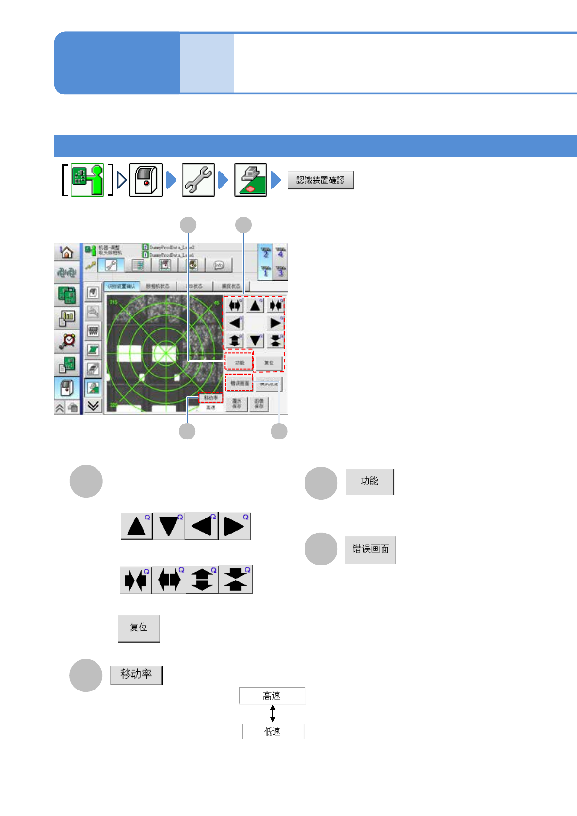 EJM8DC-MB-13E-0 3 NPM-DX 单元调整 贴装头照相机 信息的确认 1 13-2-9 -1 确认识别装置 A B 工程师手册 13-2-9 C D A B C D 光标移动 / 框尺寸调整 ■移动光标时 ■扩大或缩小框的尺寸时 ■把光标位置和框尺寸进行初始化 选择光标的移送速度。 确认贴装头照相机的状态以及各种信 息。需要时也可以进行识别装置 的设定变更。 显示「功能」画面。 显示错误画面。