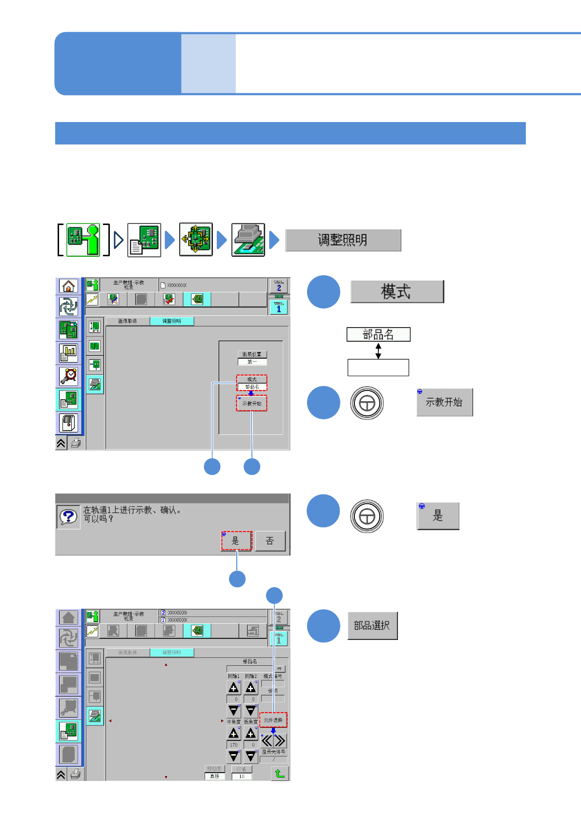 NPM-W 2 EJM7DC-MB-04O-00 4-3-2 -6 2 选择元件名称 2 3 + (检查头移动至选择的元件位置) 4 ●变更同轴 1 /同轴 2 /中角度/低角 度 的各照明値,调整到适合检查的图像 状态。 5 + ( 检查头移动至相同名称元件其他的元件 位置 ) ●其他元件时,也希望确认图像时使 用。 ●变更各照明值,同时确认是否适合 检查 状态的画面。 ●调整的照明条件适用于检查条件时 ,记 录调整值。 3 4 5 …