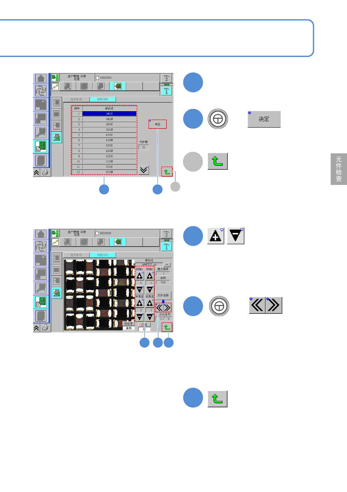 NPM-W 2 EJM7DC-MB-04O-00 生产数据 和校正 校正基板的摄像 4 操作篇 4-3-2 4-3-2 -7 1 ■模式为说明时 1 ( 显示确认图像状态的元件选择画面 ) 2 3 5 4 输入图案编号和说明 2 3 ( 在画面上显示与输入的数据一致的元件 信息 ) 4 + ( 检查头移动至所选择的元件位置) 5 ●变更同轴 1 /同轴 2 /中角度/低角 度 的各照明値,调整到适合检查的图像 状态。 ●变更各照明值,同…