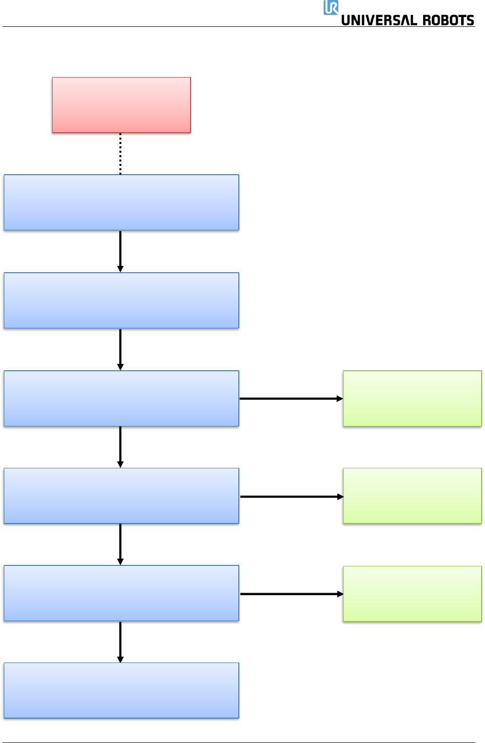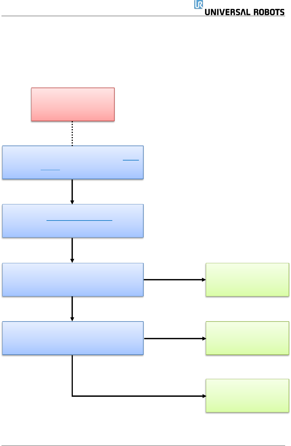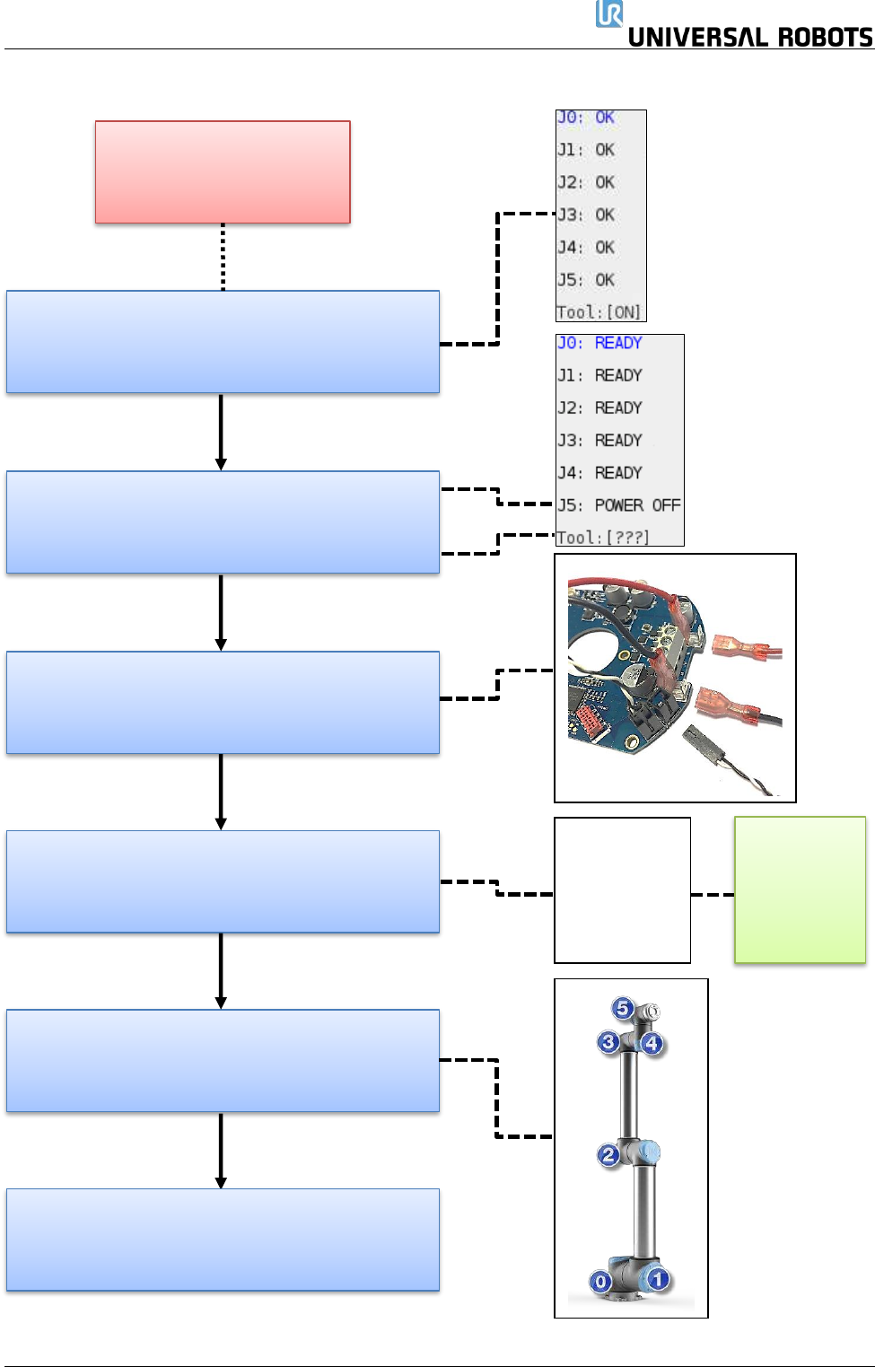 保留所有 权 利 143 Servicemanual_UR3 _en _3.2.6 5.3.5 碰撞后的检查 表 碰撞后的检查表 拆下盖子,并检查关节 内 部的零件 目视检查机械臂。 是否有任何外观受损的 零件,例如,蓝色盖 子? 在进入工作单元之前, 停止机器人程序,并按 下紧急停止按钮 按下示教器背后的自由 驱动按钮,检查所有关 节的自由驱动功能 > 是否观察出任 何异常的摩 擦或行为? 检查有行为异常的关节 检查日志历史记录…