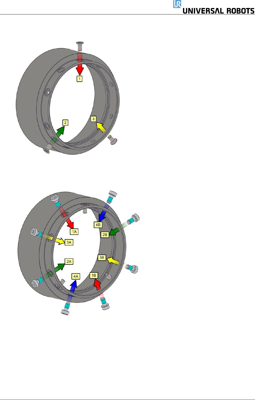 保留所有 权 利 25 Servicemanual_UR3 _en _3.2.6 2. 根据以下示例,插入 六角沉头 螺钉,并上紧至 正确的扭矩。 示例: 1 、 2 、 3 3. 根据以下示例,插入 六角 螺钉,并交叉上紧至正 确的扭矩。 示例: 1A 、 1B 、 2A 、 2B 等