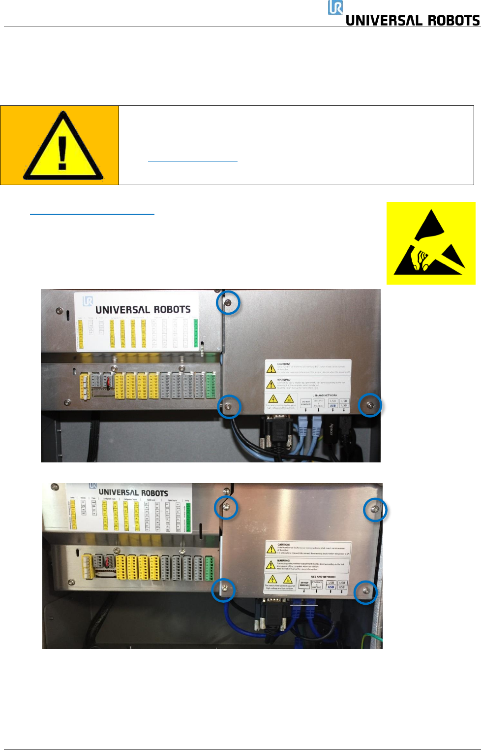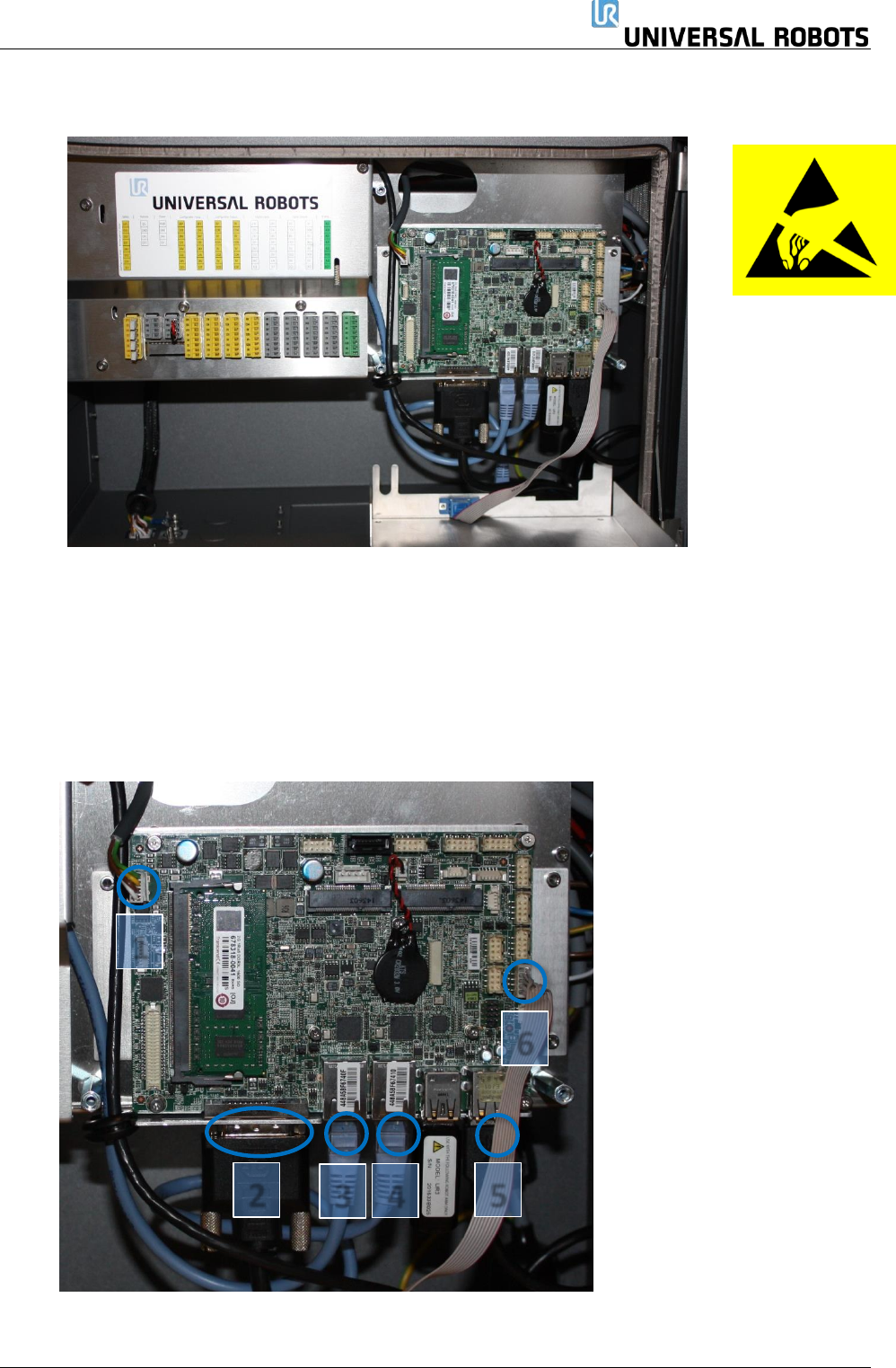 保留所有 权 利 73 Servicemanual_UR3 _en _3.2.6 2. 拆下铝盖板 3. 从主机板上断开电缆连 接: 1. 白色插头,带白 色、棕色、黄色和 绿色电线, 12 V 电源 2. 用于示教器显示 屏的 DVI 电缆 3. 以太网电缆至安 全控制板 SCB 4. 以太网电缆至外 部连接器 5. 黑色 USB 电缆用 于示教器 USB 连接 器 6. 用于 RS232- 连接 的扁平电缆,连接 示教器触控屏 1 …