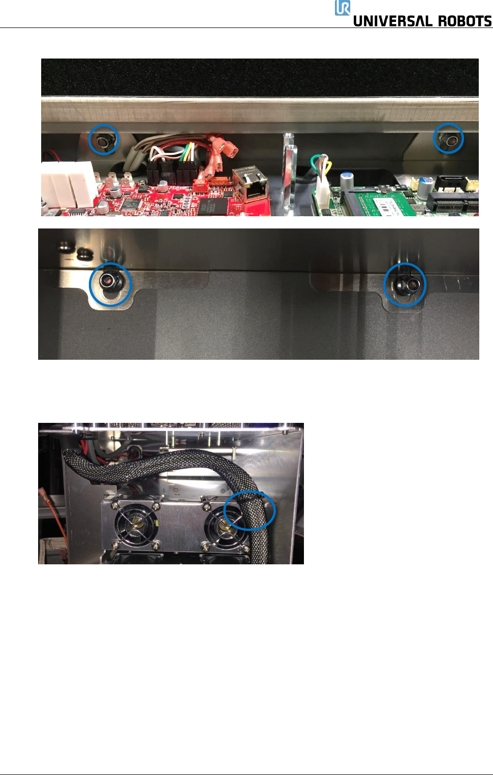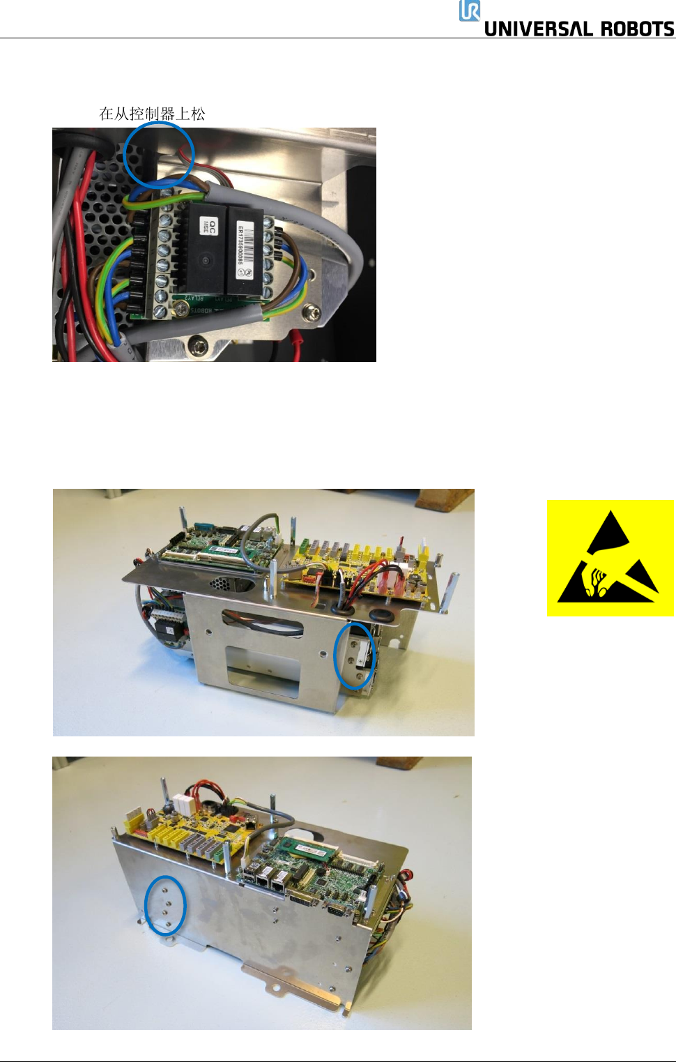 保留所有 权 利 86 Servicemanual_UR3 _en _3.2.6 3. 拆下控制器模块顶部和 底部的 4 个螺母( M6 )。 4. 轻轻地从控制箱中取出 控制器模块。 5. 模块逆时针转动 9 0° 度,并将其放在控制 器边缘。 6. 剪断连接机器人电缆的 电缆扎带,从安全控制板 上拔下连接 器,然后拆下电 缆。