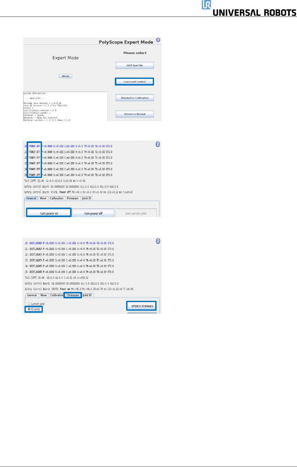 5. 选择 Firmware(固件)选项卡,标记所有关节,然后按 UPDATE Firmware(更新固件)。