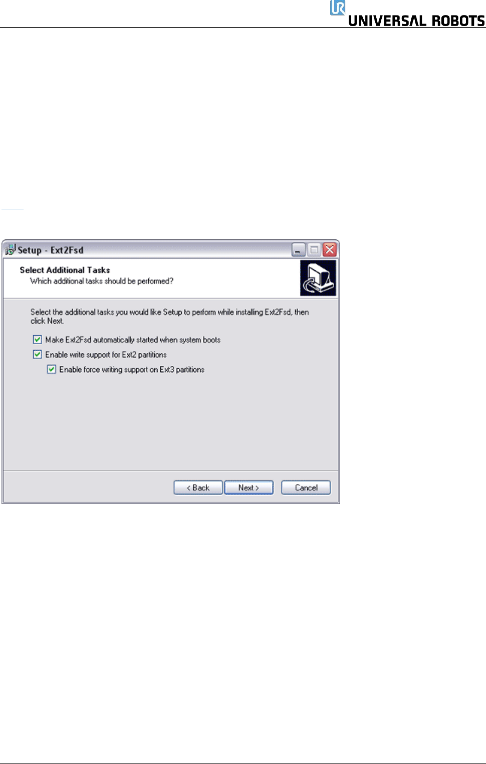 需要 Linux 软件文件系统驱动程序;优傲机器人推荐使用免费的 Linux 分区驱动程序 Ext2Fsd,但也可
