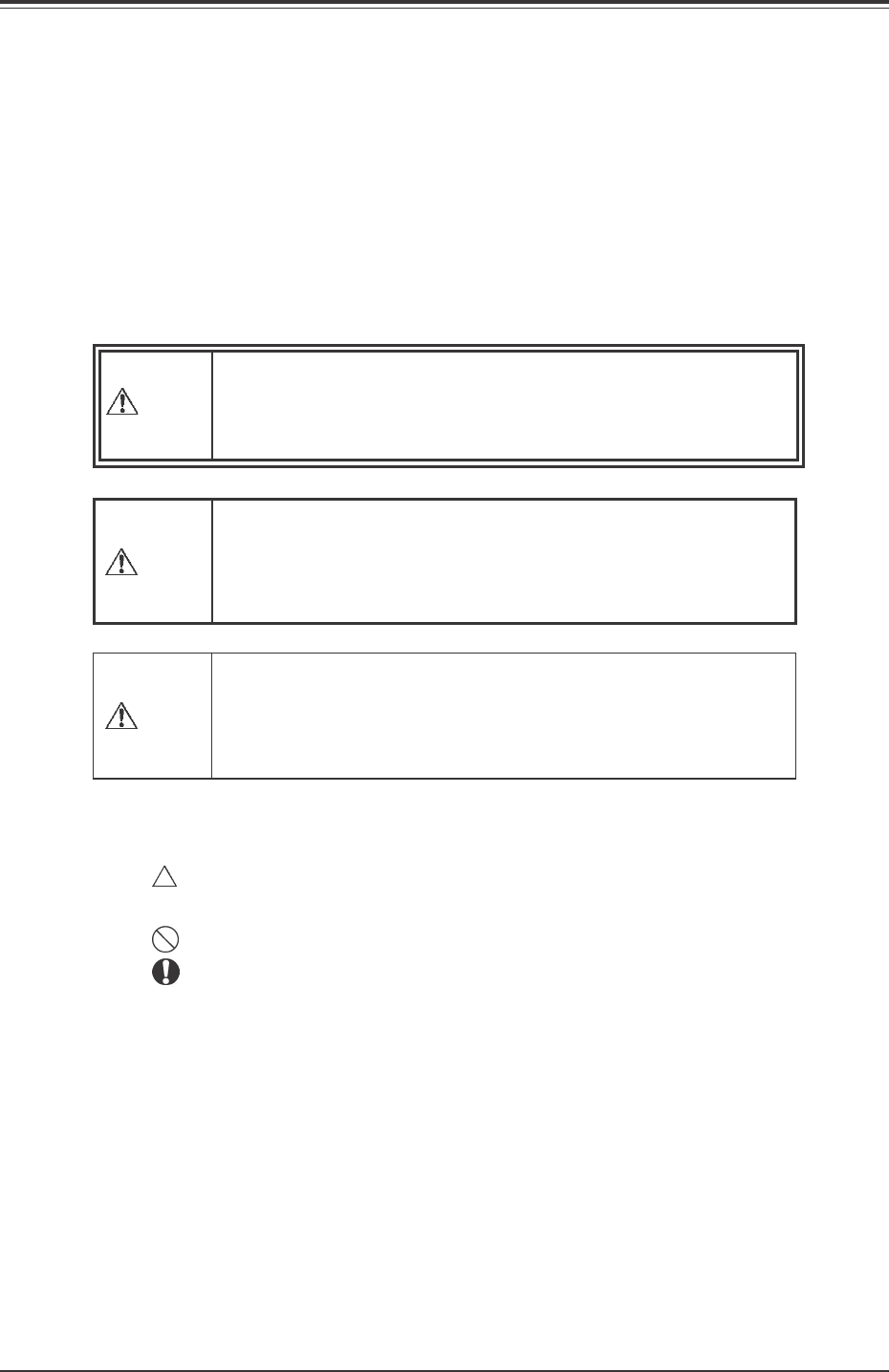 • 警告表示は、危険の度合いにより表示の意味が次の 3 種類に分かれて