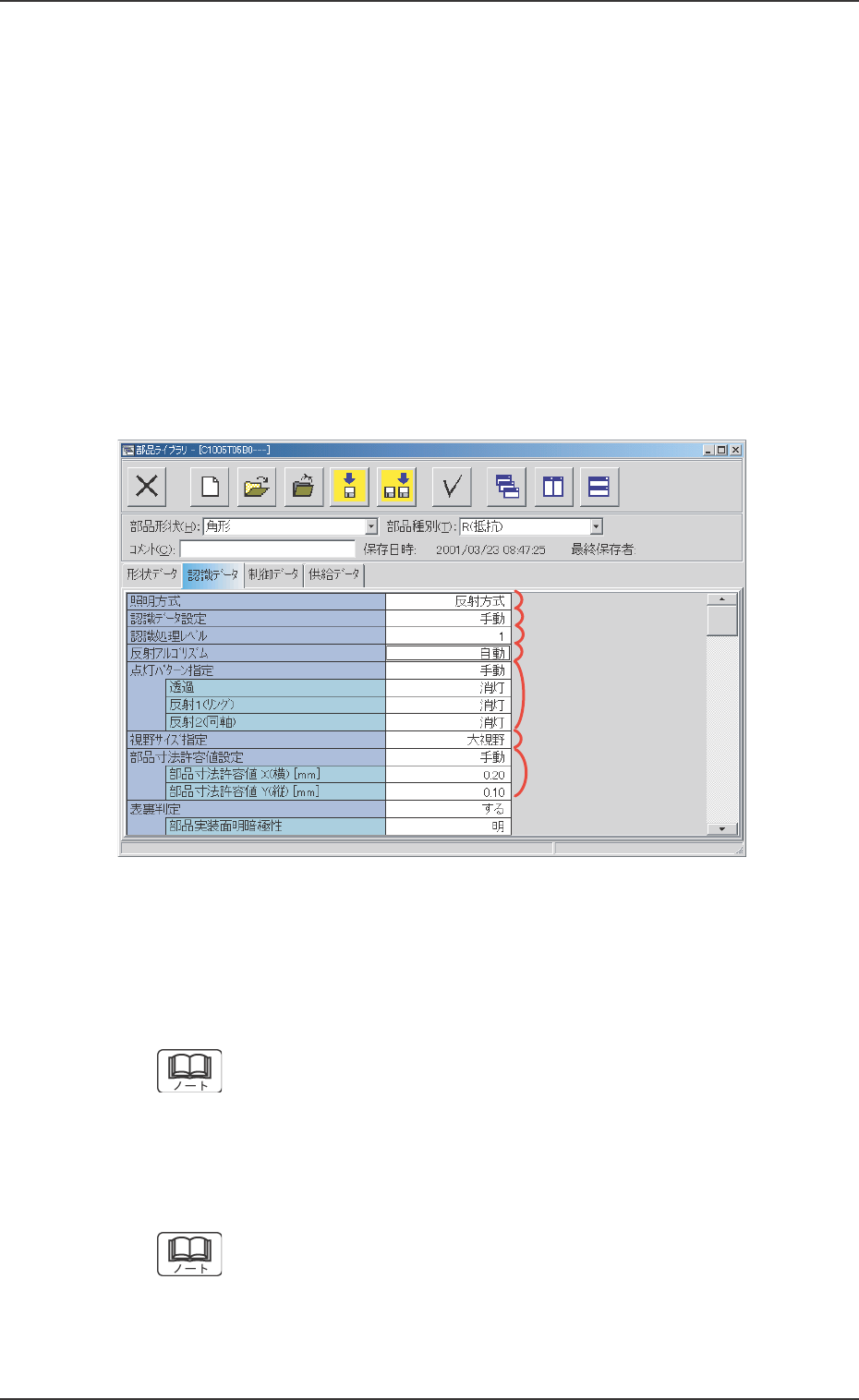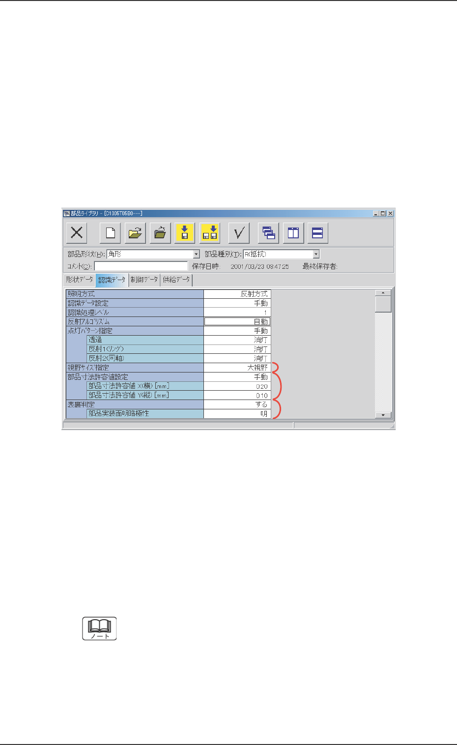 3.3 3.3 3.3 3.3 3.3 “ “ “ “ “ 認 認 認 認 認 識 識 識 識 識 デ デ デ デ デ ー ー ー ー ー タ タ タ タ タ ” ” ” ” ” タブ タブ タブ タブ タブ • • • • • シートの表示 シートの表示 シートの表示 シートの表示 シートの表示 [認識データ] タブを押すと、 “認識データ”タブシートが表示され ます。 “認識データ”タブシートは、部品形状ごとに分類すると以下の 2 …