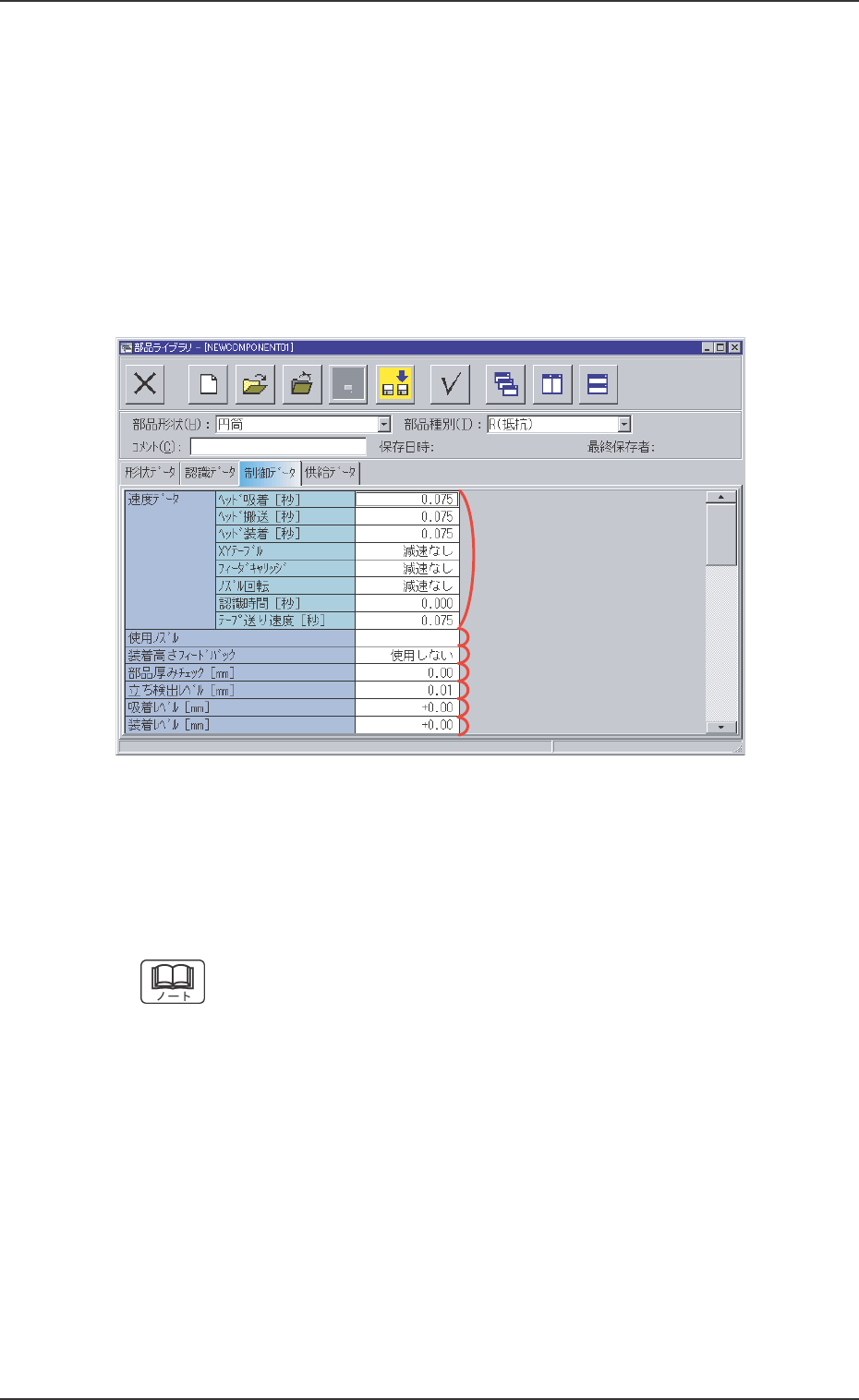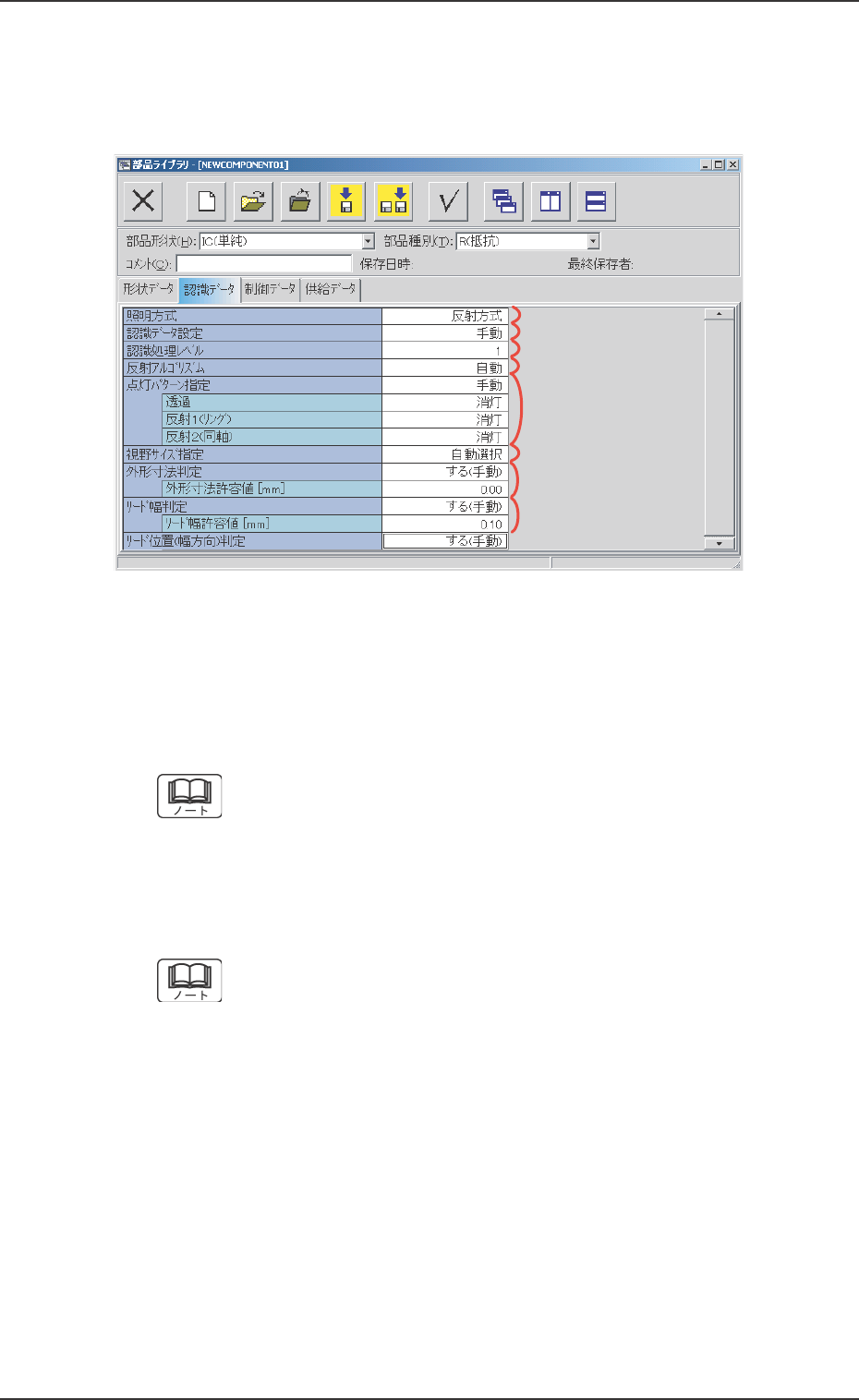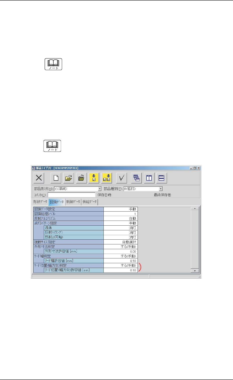 0306-006 3 - 29 AGH01JDTP 3.3 “認識 データ”タブ *7 *7 *7 *7 *7 外形寸法判定 外形寸法判定 外形寸法判定 外形寸法判定 外形寸法判定 外形寸法許容値 外形寸法許容値 外形寸法許容値 外形寸法許容値 外形寸法許容値 外形寸法判定を“する(手動) ”に設定した場合、テキスト ボックスにデータを入力します。 部品形状がコネクタ(単純) 、 コネクタ(複雑) 、その他 リード付き(単純) 、 その…