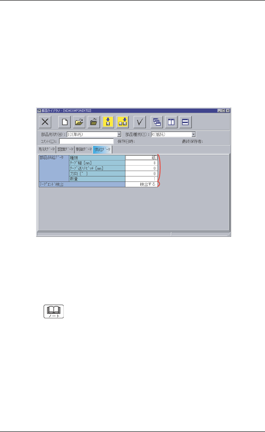 3.5 “供給 データ”タブ 0206-004 3 - 32 AGH01JDTP 3.5 3.5 3.5 3.5 3.5 “ “ “ “ “ 供 供 供 供 供 給 給 給 給 給 デ デ デ デ デ ー ー ー ー ー タ タ タ タ タ ” ” ” ” ” タブ タブ タブ タブ タブ すべての部品形状“円筒、角形、異形(単純) 、I C(単純) 、IC(複 雑) 、コネクタ(単純) 、コネクタ(複雑) 、その他リード付…