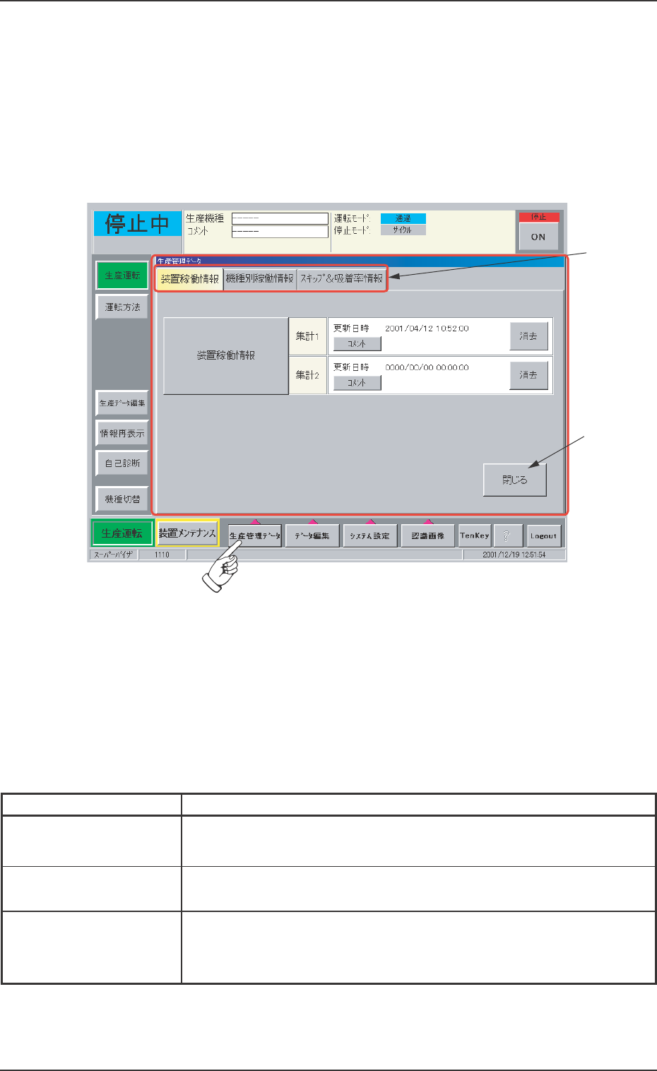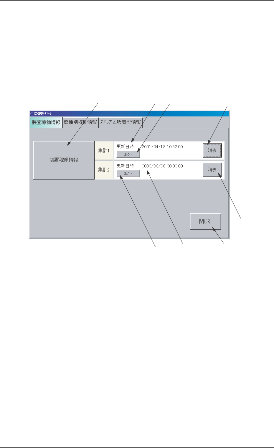 2.1 2.1 2.1 2.1 2.1 “ “ “ “ “ 装 装 装 装 装 置 置 置 置 置 稼 稼 稼 稼 稼 働 働 働 働 働 情 情 情 情 情 報 報 報 報 報 ” ” ” ” ” タブ タブ タブ タブ タブ 装置全体の稼働情報を集計表示するための“装置稼 働情報”画面を 表示します。 • • • • • シートの表示 シートの表示 シートの表示 シートの表示 シートの表示 “生産管理データ”メニュー画面で、 [装置…