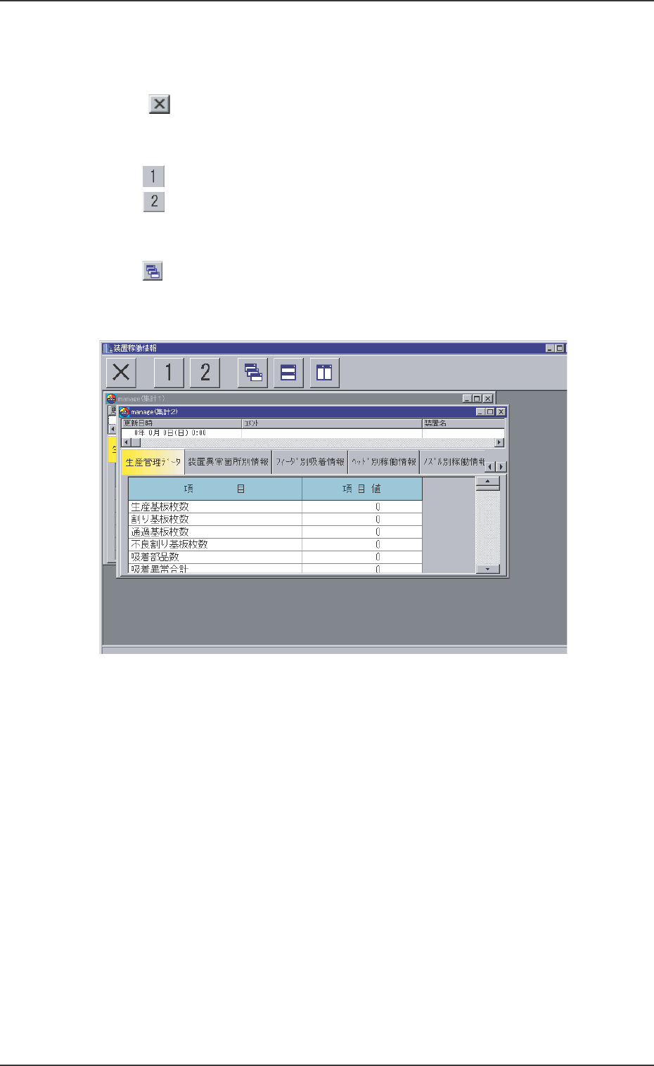 3.1 3.1 3.1 3.1 3.1 “ “ “ “ “ 装 装 装 装 装 置 置 置 置 置 稼 稼 稼 稼 稼 働 働 働 働 働 情 情 情 情 情 報 報 報 報 報 ” ” ” ” ” 画面の基本操作 画面の基本操作 画面の基本操作 画面の基本操作 画面の基本操作 3.1.1 3.1.1 3.1.1 3.1.1 3.1.1 ツールバーとアイコン ツールバーとアイコン ツールバーとアイコン ツールバーとアイコン ツールバーと…
