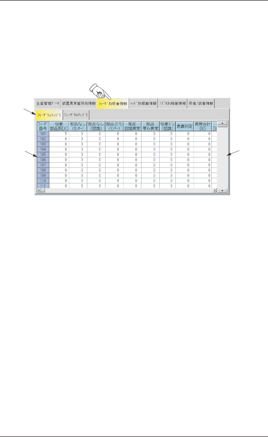 “装置稼働情報”画面で[フィーダ別吸着情報]タブを押すと、以下