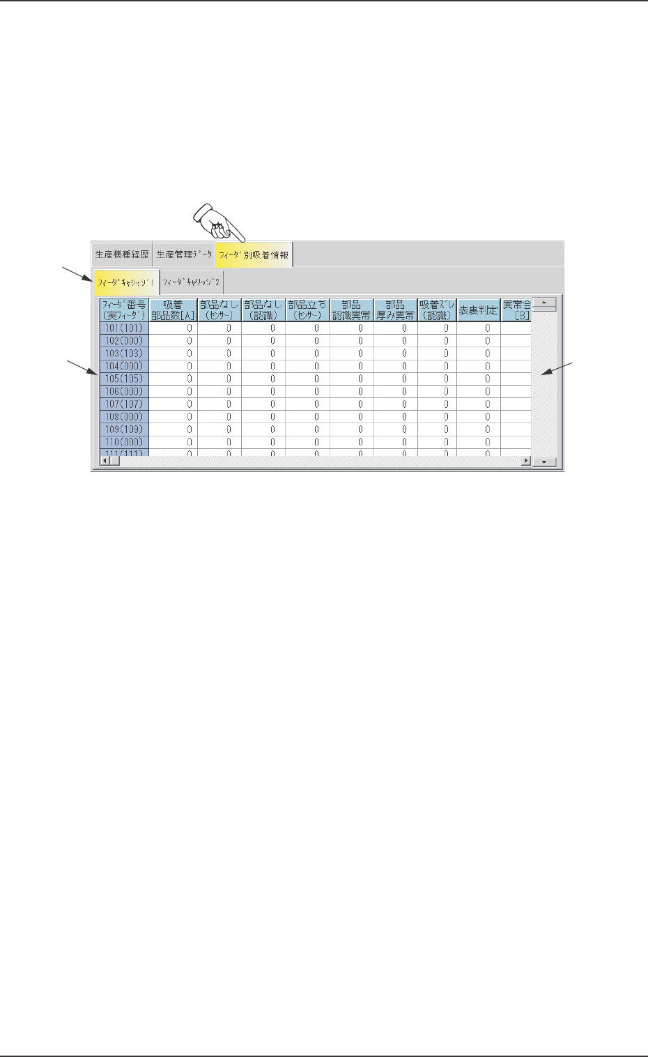 タブシート上に表示しきれないフィーダ番号について、下向き