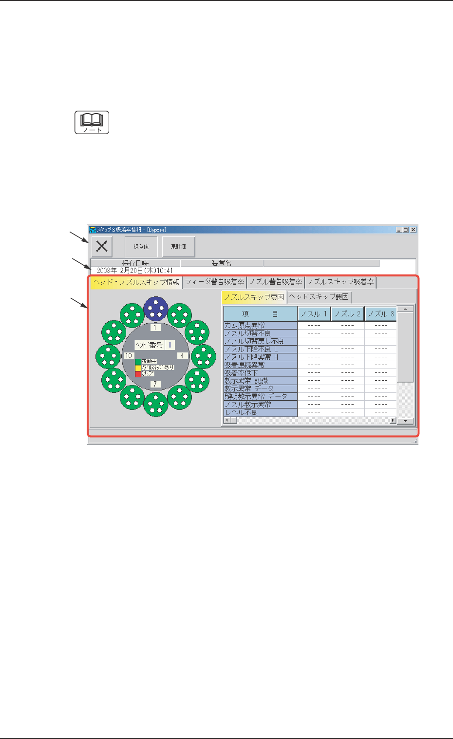 スキップ&吸着率情報の保存日時、装置名が表示されます。