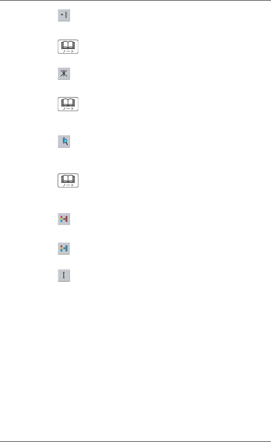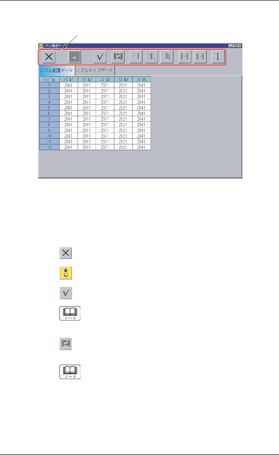 : ノズルタイプを新規追加する場合に、 “ノズ ルタイププロパティ”画面を開きます。 “ノズルタイプデータ” タブシートでのみ、使用可能で す。 : 選択したノズルタイプを削除します。 “ノズルタイプデータ” タブシートでのみ、使用可能で す。 : ノズルタイプを変更する場合に、選択した ノズルタイプの“ノズルタイプのプロパ ティ”画面を開きます。 “ノズルタイプデータ” タブシートでのみ、使用可能で す。 : 選択した範囲の一番上のデ…