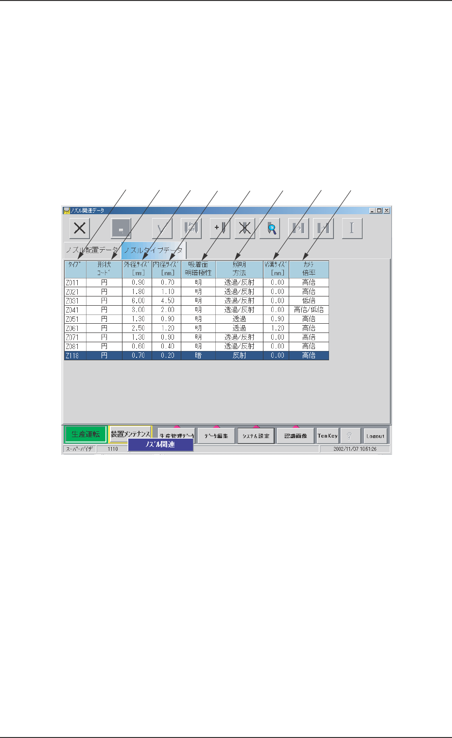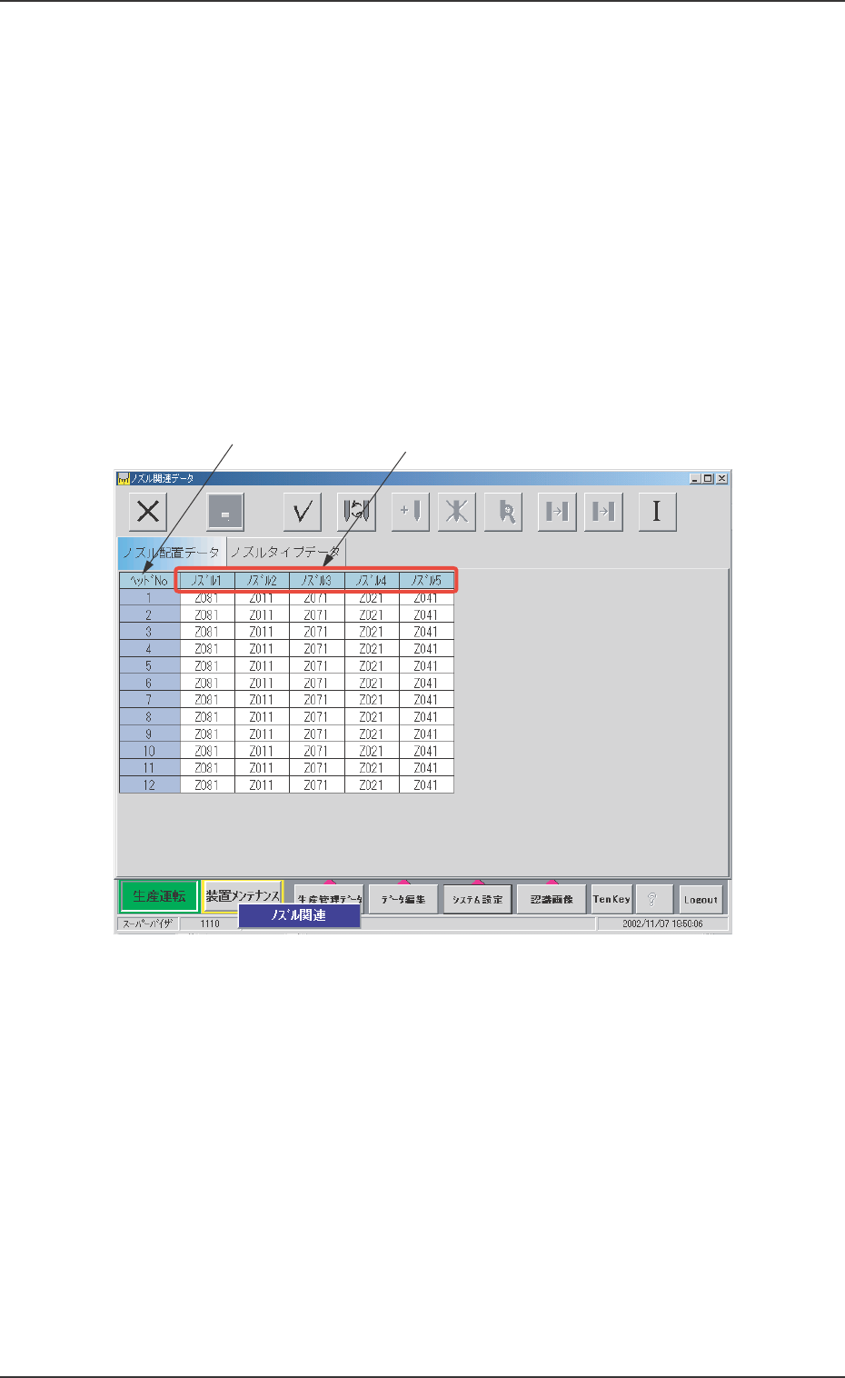 “ノズル関連データ”タブシートの[ノズル配置データ]タブを押す