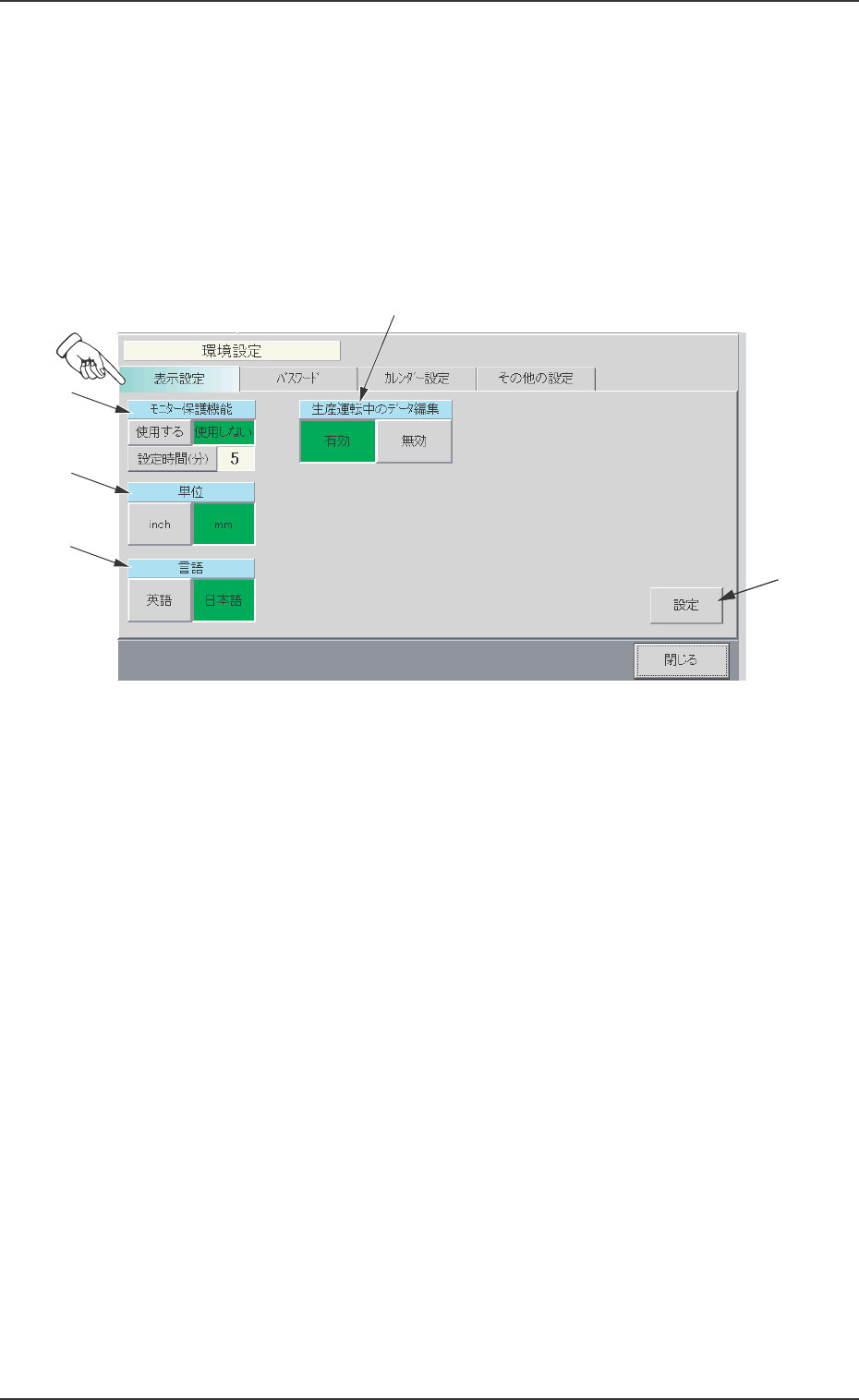 (2) モニター保護機能を有効にしたとき([ 使用する]ボタンが緑 色になります)、 [ 設定時間(分)]ボタンを押すと、 以下の “設定時間(分)”編集画面が表示されます。 Fig.3E52-2 “設定時 間(分)”編集画面 モニター保護機能が起動するまでの時間(5 ∼ 6 0 分 ) を入力 して、 [設定] ボタンを押します。 *2 *2 *2 *2 *2 単位 単位 単位 単位 単位 [inch]ボタンまたは [mm]ボタンを押…