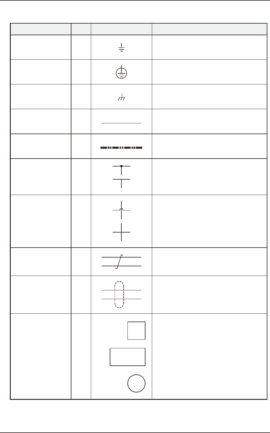 193-5100 CUKYX 1. 电路图符号 4-1 1. 电路图符号 名称 符号 图形 符号 备注 接地 ( 一般 ) 保护接地 连接 ( Chassis ) 电缆 W 只 有电 路框图的信号 线使用 W 标 注。 光纤电 缆 连接 表示该电 缆为电 气连接。 交叉 表示该电 缆不 是电 气连 接。 双绞线 表 示 信 号 线 为双 绞 线 。 屏蔽 线 表 示 该 线 为屏 蔽 线。 设备或 装置 (a) (b) (c)