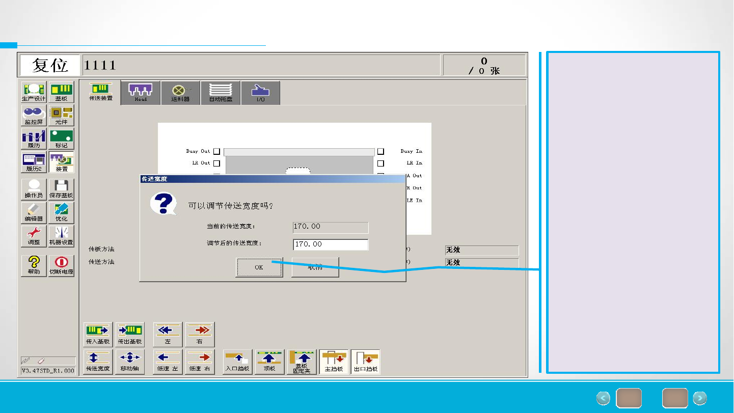 of 66 9 3.轨道宽度调整 使用鼠标将主挡板按钮开 关打开,放入PCB板至待 机感应器处,点击 “右” 键使传送带向右运转,将 PCB板移动至主挡板处。