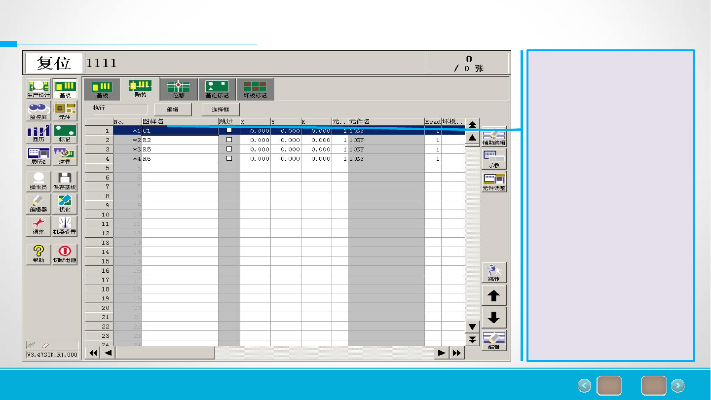 of 66 34 9.元件贴装坐标设定 元件物料设定完成,点击 基板画面,切换至贴装信 息画面。
