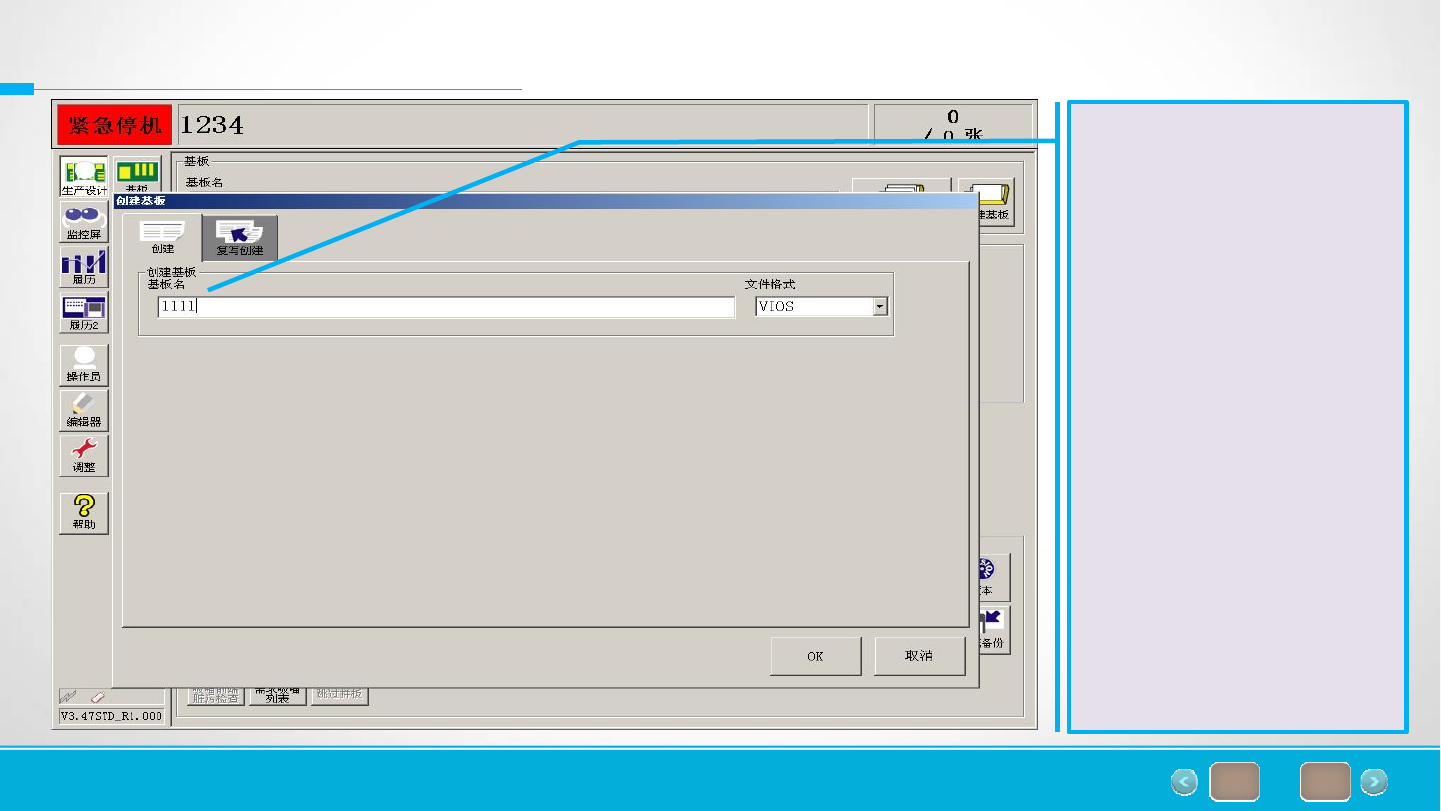 of 66 3 1.2建立基板名-创建程序名 称 1.2.1进入“创建基板” 对话框后,在基板名空格 中输入需要创建的程序名。 1.2.2创建完成后点击OK 按扭进入到“基板设置” 对话框 。 注:该名称一般与BOM 中的机种名一致。