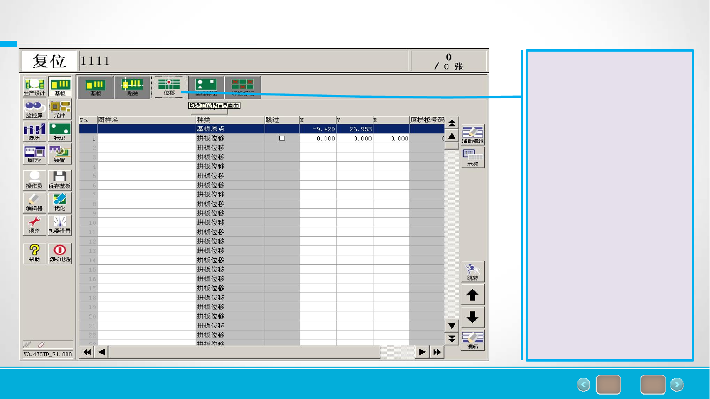 of 66 41 11.基板—拼板设定 元件设定完成后,点击位 移信息画面,进行拼板设 定。 离线程序调入已有拼板信 息,一般不用改动,如需 调整需要再次查看元件坐 标。