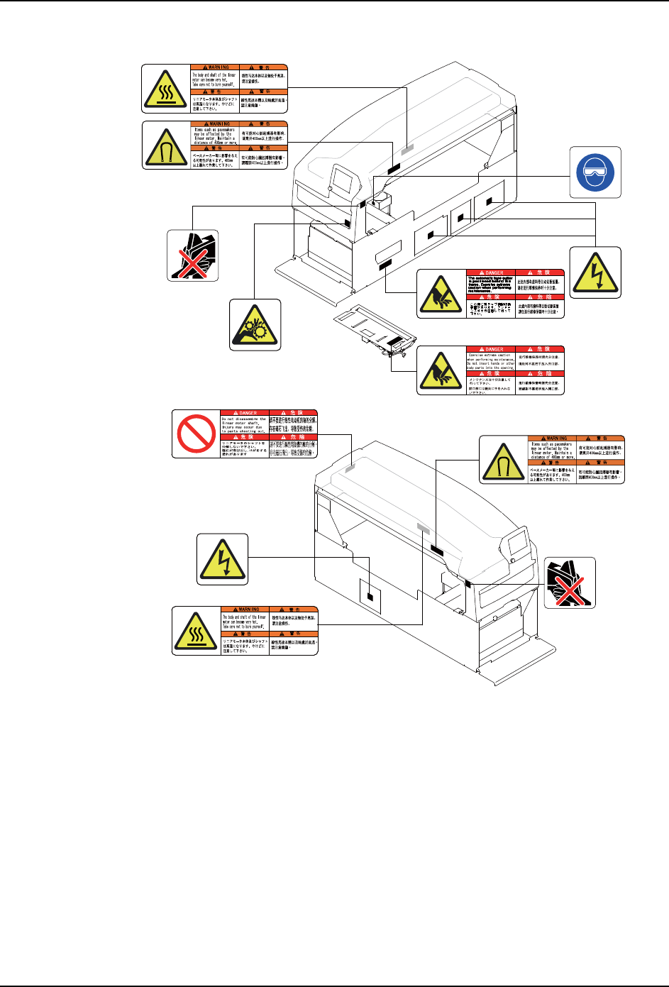 表示使用机器时的注意事项的安全标识贴在机器的下图所示位置。请仔细阅读记载内容,安