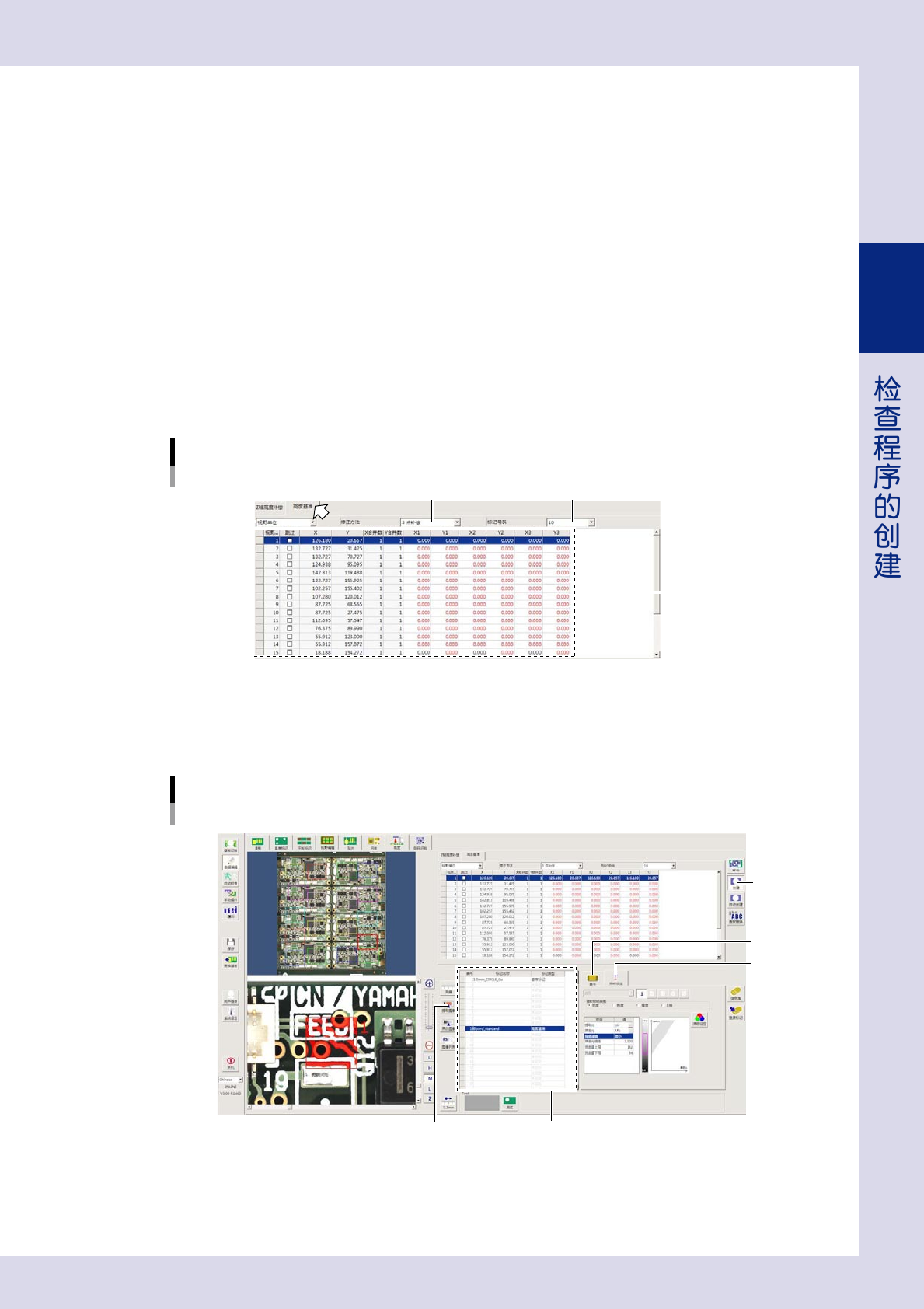 2-60 2 5 按[创 建]按 钮 。 相机移到测定点位置。 6 设置“照明设定”参数。 参照前述“以元件为单位测定”的 Step5 的步骤设置“照明设定”参数。 7 按 [ 提取图像 ] 按钮,确认提取状态。 确认基板面已显示为红色。 8 按 [ 自动创建 ] 按钮,搜索测定点。 显示确认对话框之后,按 [ 是 ] 按钮开始搜索。 自动从 1 号视野开始按顺序搜索最佳测定点,并自动设置坐标。 只有搜索成功的点才会自动设置坐标,若坐标…