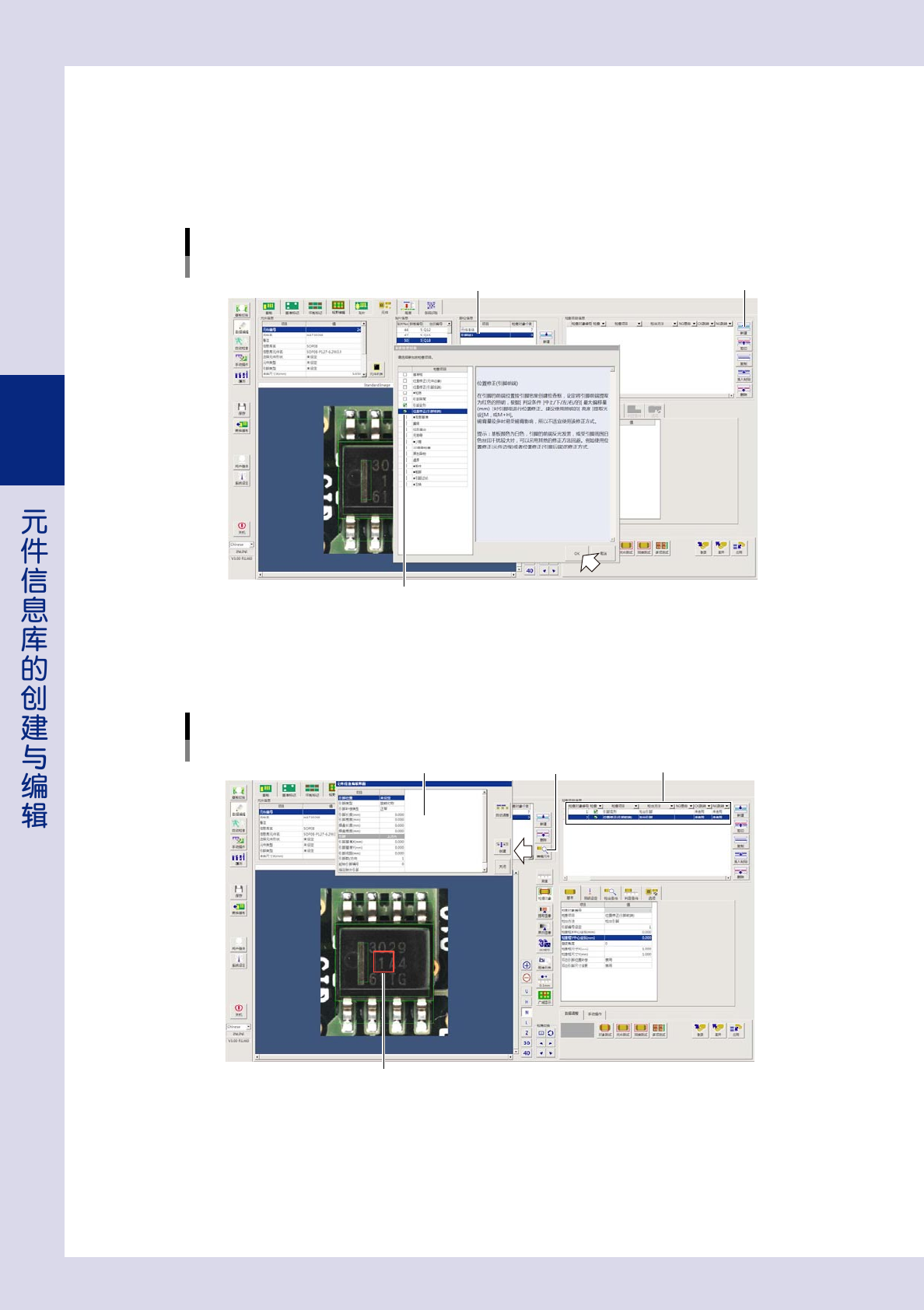 3-10 3 4 按“检查项目信息”中的 [ 新建 ] 按钮。 显示“新建检查对象”对话框。 5 选择要新建的检查项目之后,按 [OK] 按钮。 选定的检查项目 (1 根引脚的检查对象 ) 被新建到“检查项目信息”中,检查对象显示在元件的中心。 新建检查对象 勾选检查项目 添加的部位 26314-P7-10 6 按“部位信息”的 [ 编辑元件 ] 按钮。 显示“元件信息编辑界面”对话框。 元件信息编辑界面 新建的检查对象 元件信息编…