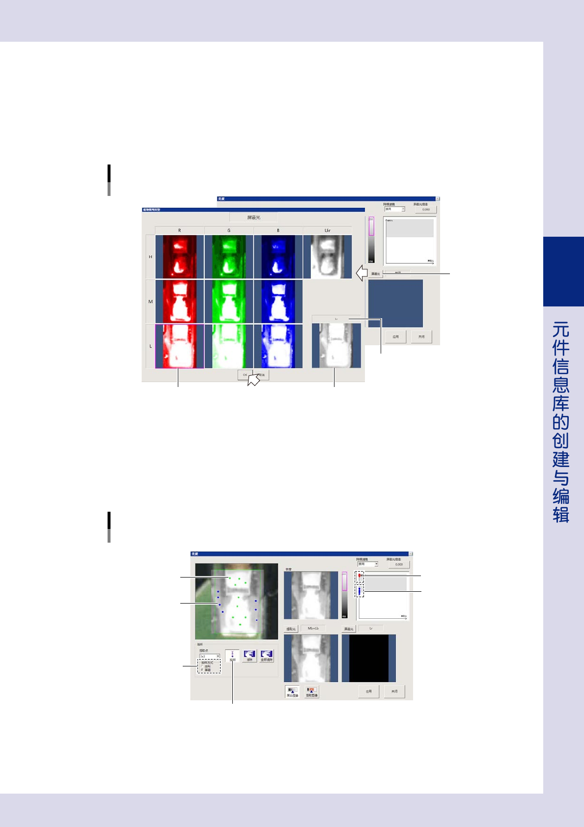 3-25 3 2 选择屏蔽光。 使想要排除在检查之外的部分反差明显的照明,称为“屏蔽光” 。( 也可以不选 ) 选择屏蔽光的方法如下 : 1. 按“亮度”画面的 [ 屏蔽光 ] 按钮,打开“提取照明类型”画面。 2. 选择 1 张 ( 只能选 1 张 ) 检查对象物以外的部分反差明显的图像。 3. 按 [OK] 按钮,保存设置。 提取照明类型:亮度 屏蔽光 选择图像 被选定的图像 图像名 [屏蔽光]按钮 26329-P7-10 3 设置…